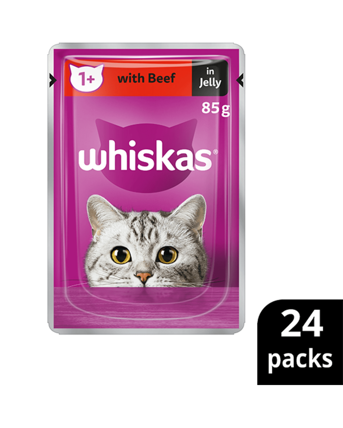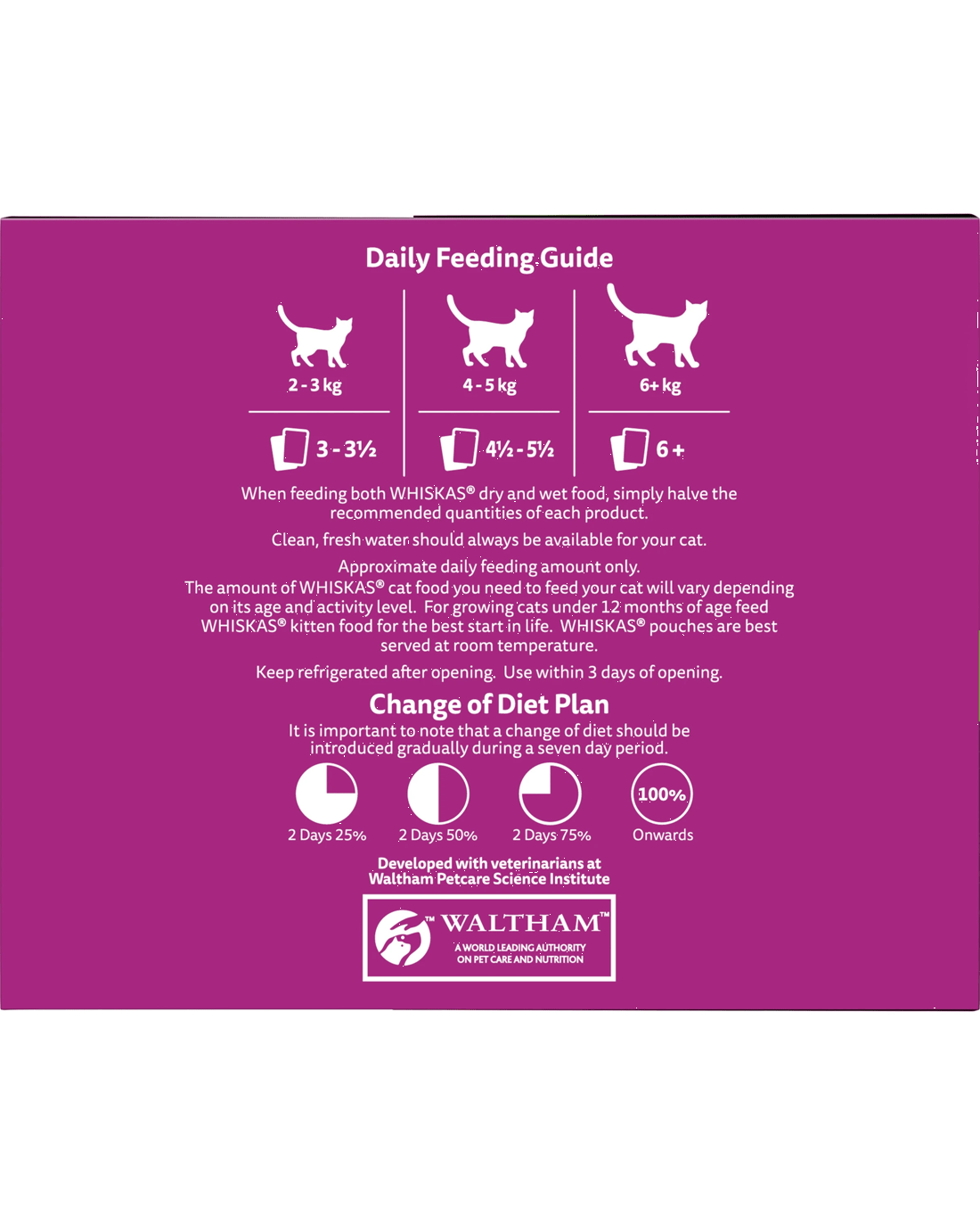 - The amount of Whiskas cat food you need to feed your cat will vary depending on its age and activity level. For growing cats under 12 months of age feed Whiskas kitten food for the best start in life. Whiskas pouches are best served at room temperature.