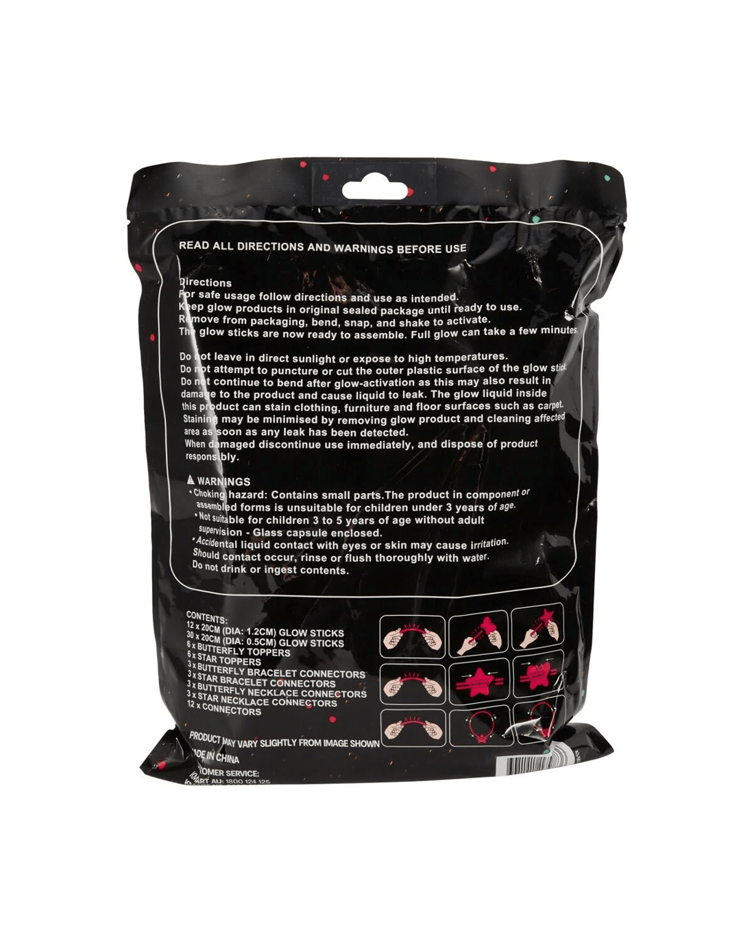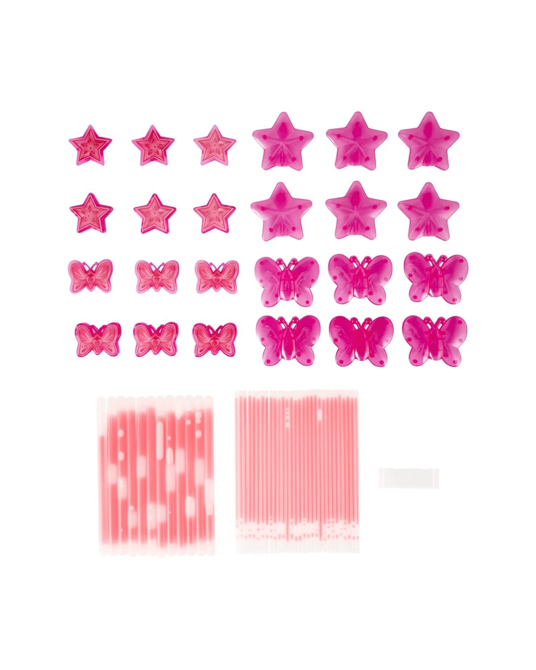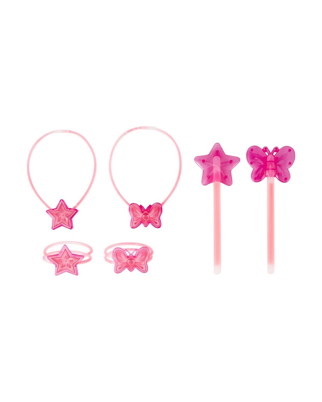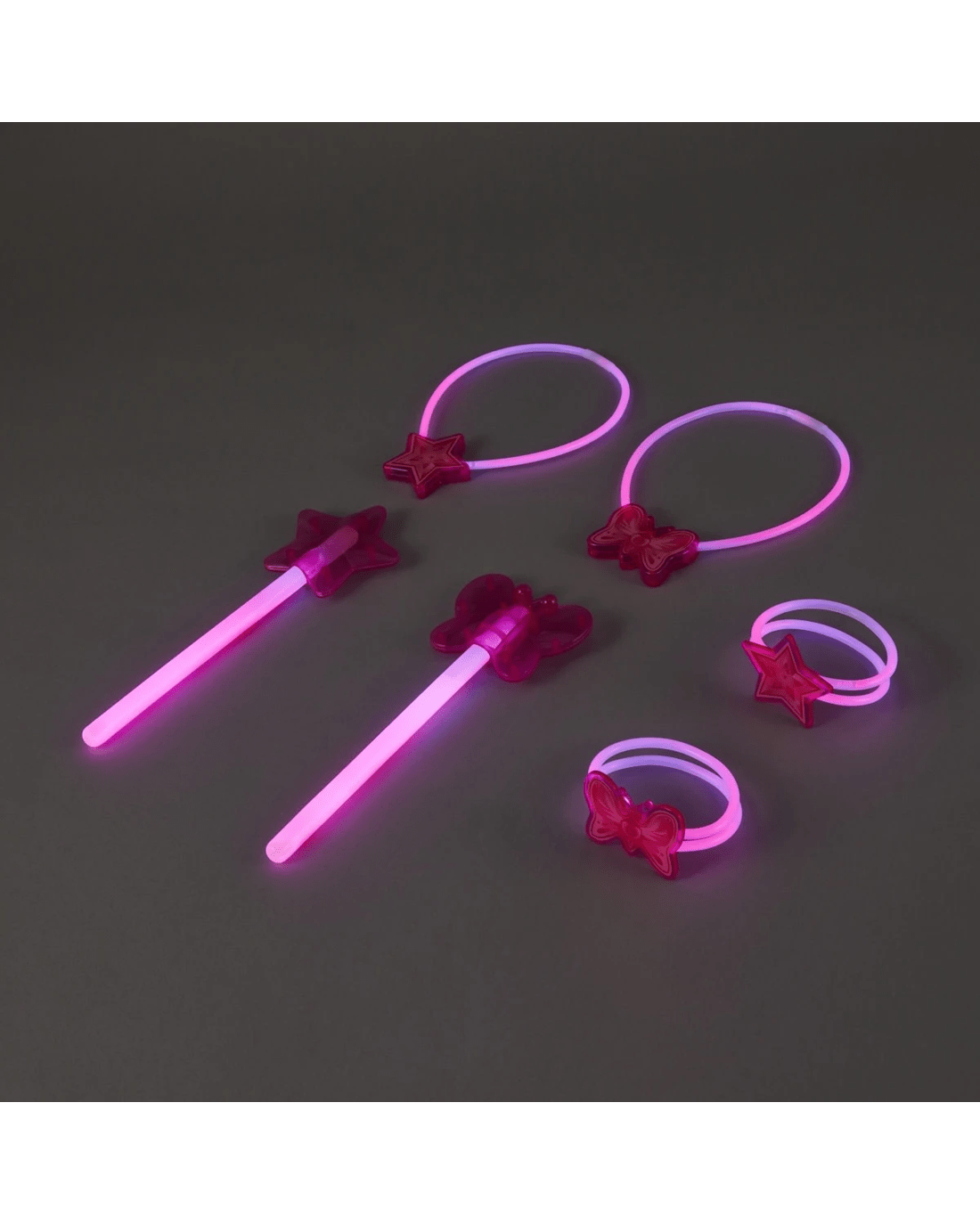 • Includes 12 x 20cm glow sticks, 30 x 20cm glow sticks, 6 x butterfly toppers, 6 x star toppers, 3 x butterfly bracelet connectors, 3 x star bracelet connectors, 3 x butterfly necklace connectors and 12 x connectors