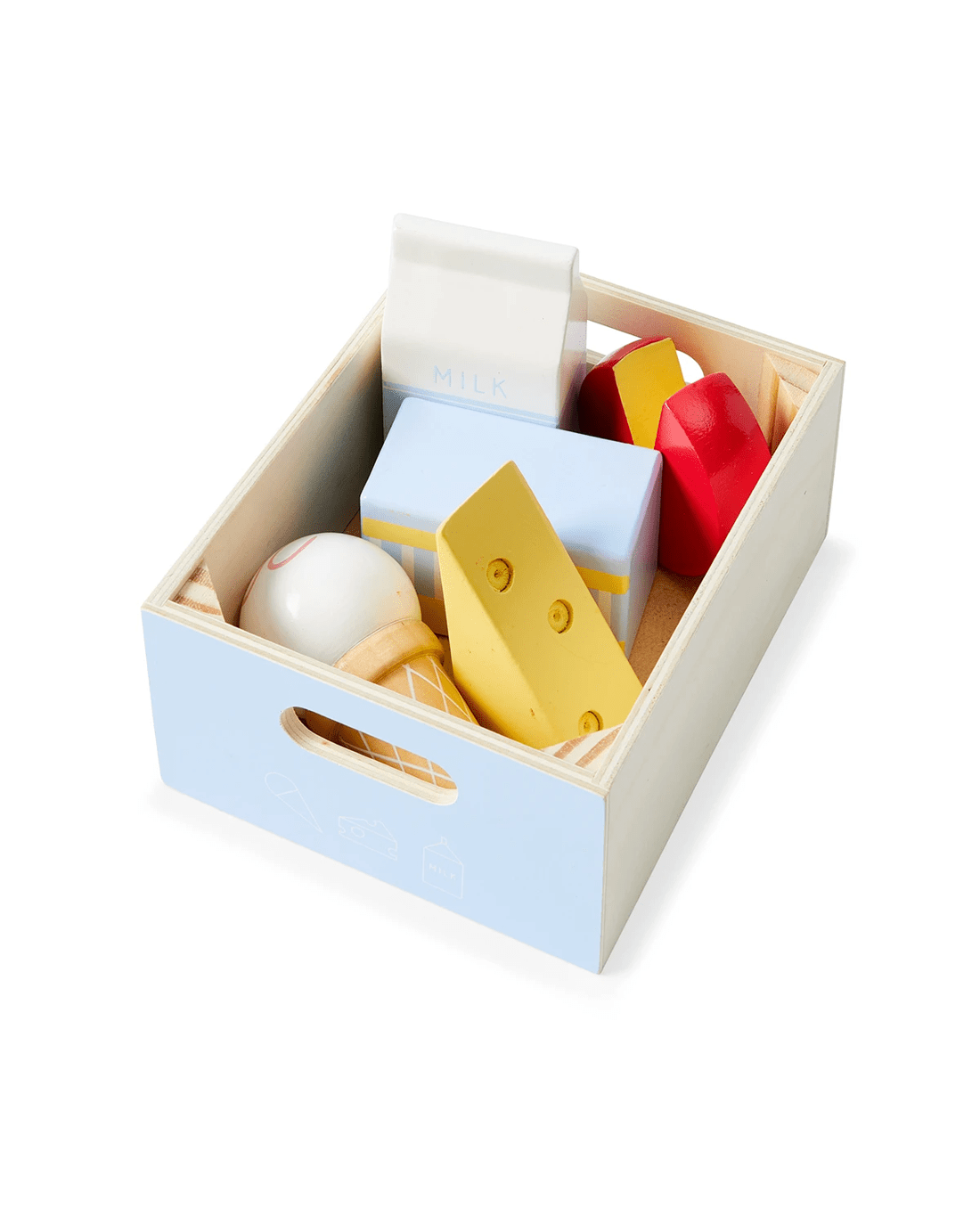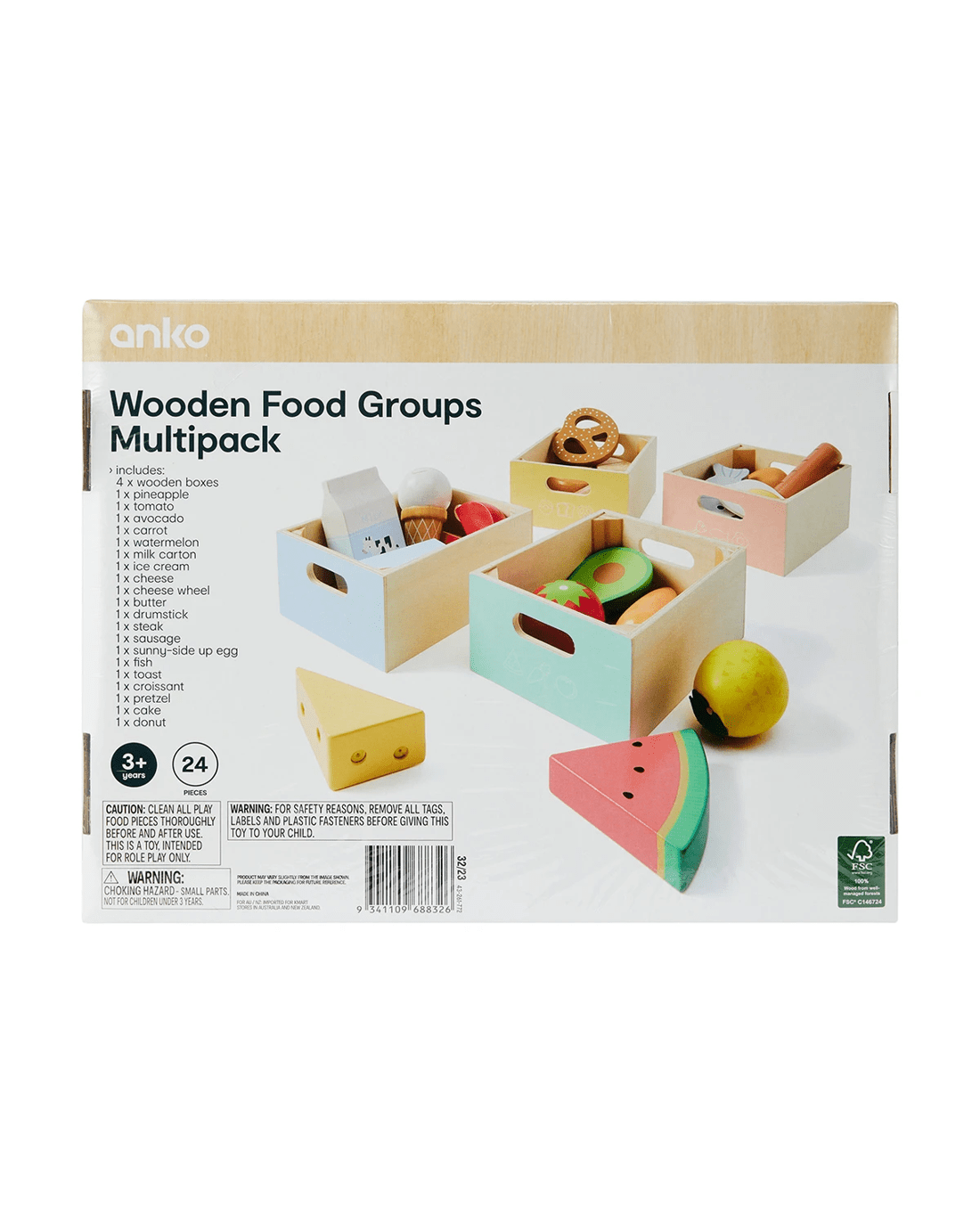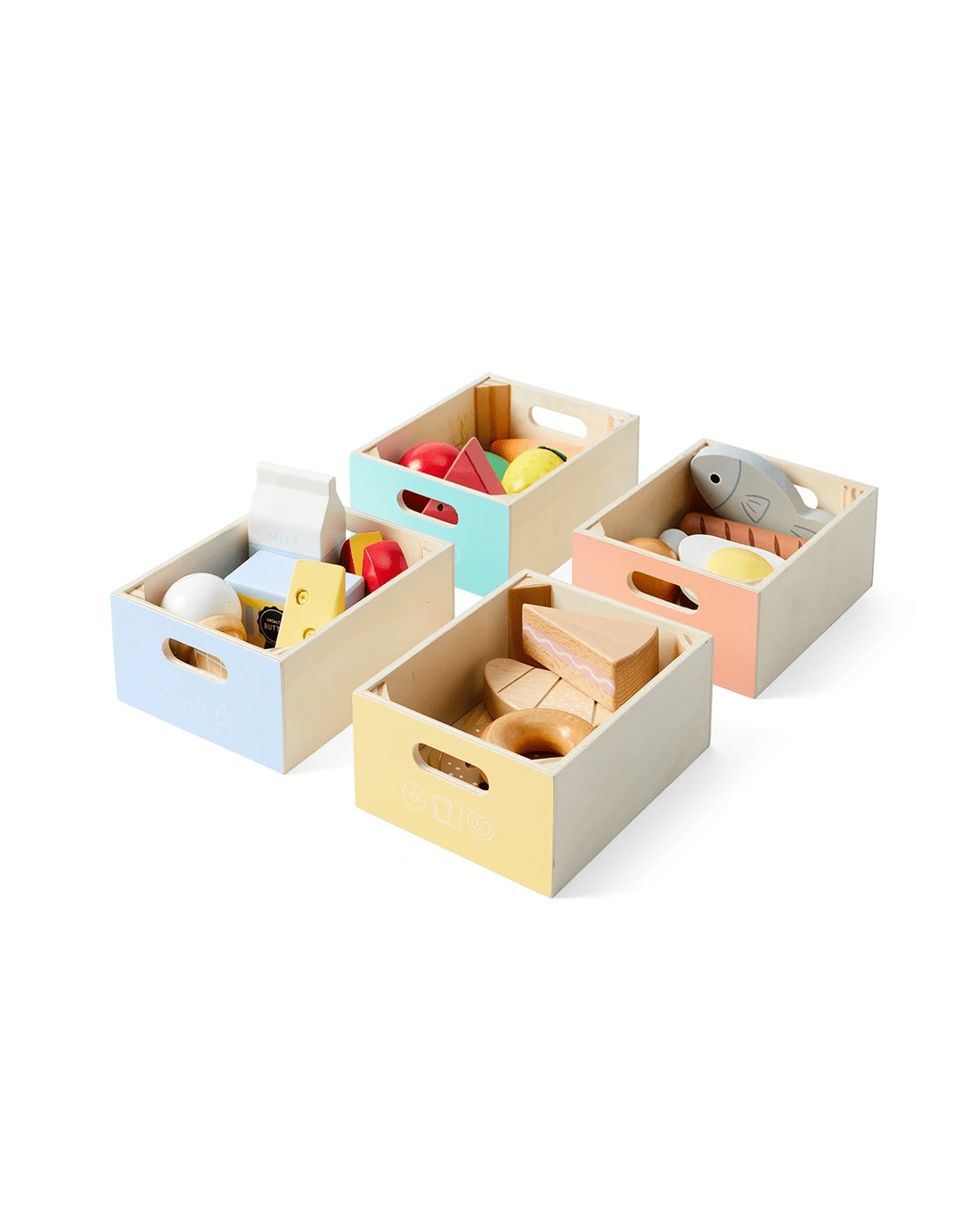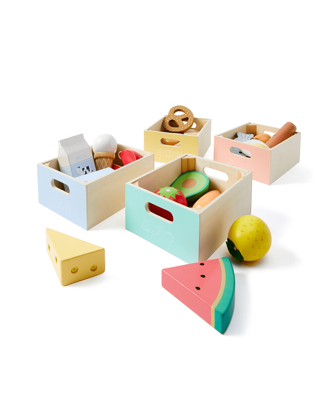 - Includes 4 x wooden boxes, 1 x pineapple, 1 x tomato, 1 x avocado, 1 x carrot, 1 x watermelon, 1 x milk carton, 1 x ice cream, 1 x cheese, 1 x cheese wheel, 1 x butter, 1 x drumstick, 1 x steak, 1 x sausage, 1 x sunny-side up egg, 1 x fish, 1 x toast, 1 x croissant, 1 x pretzel, 1 x cake and 1 x donut