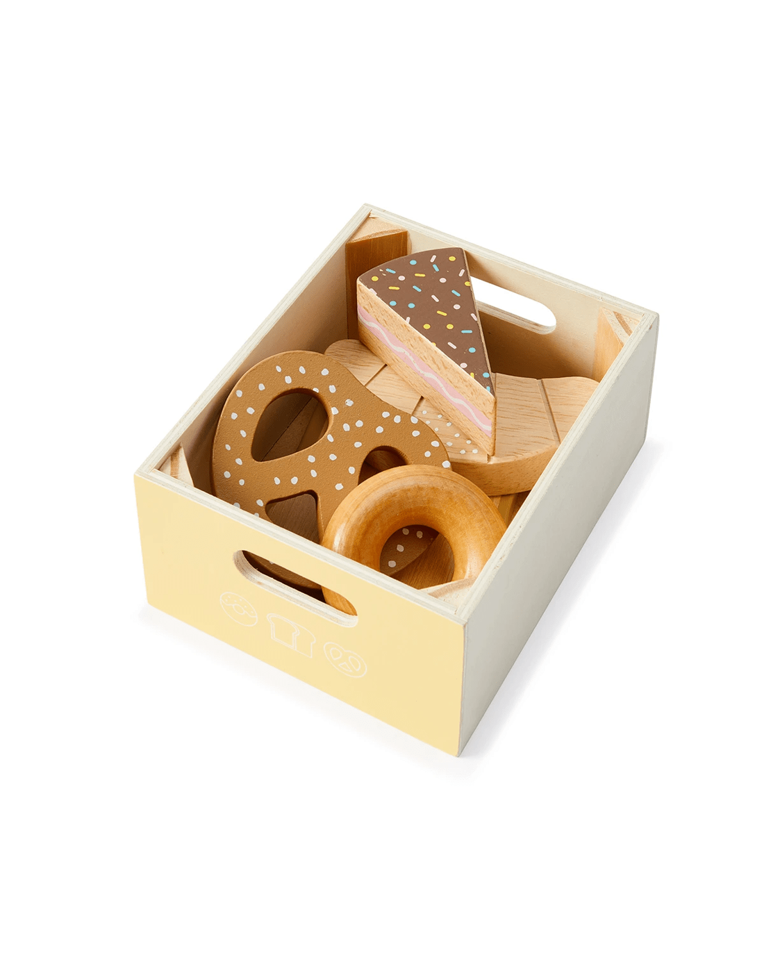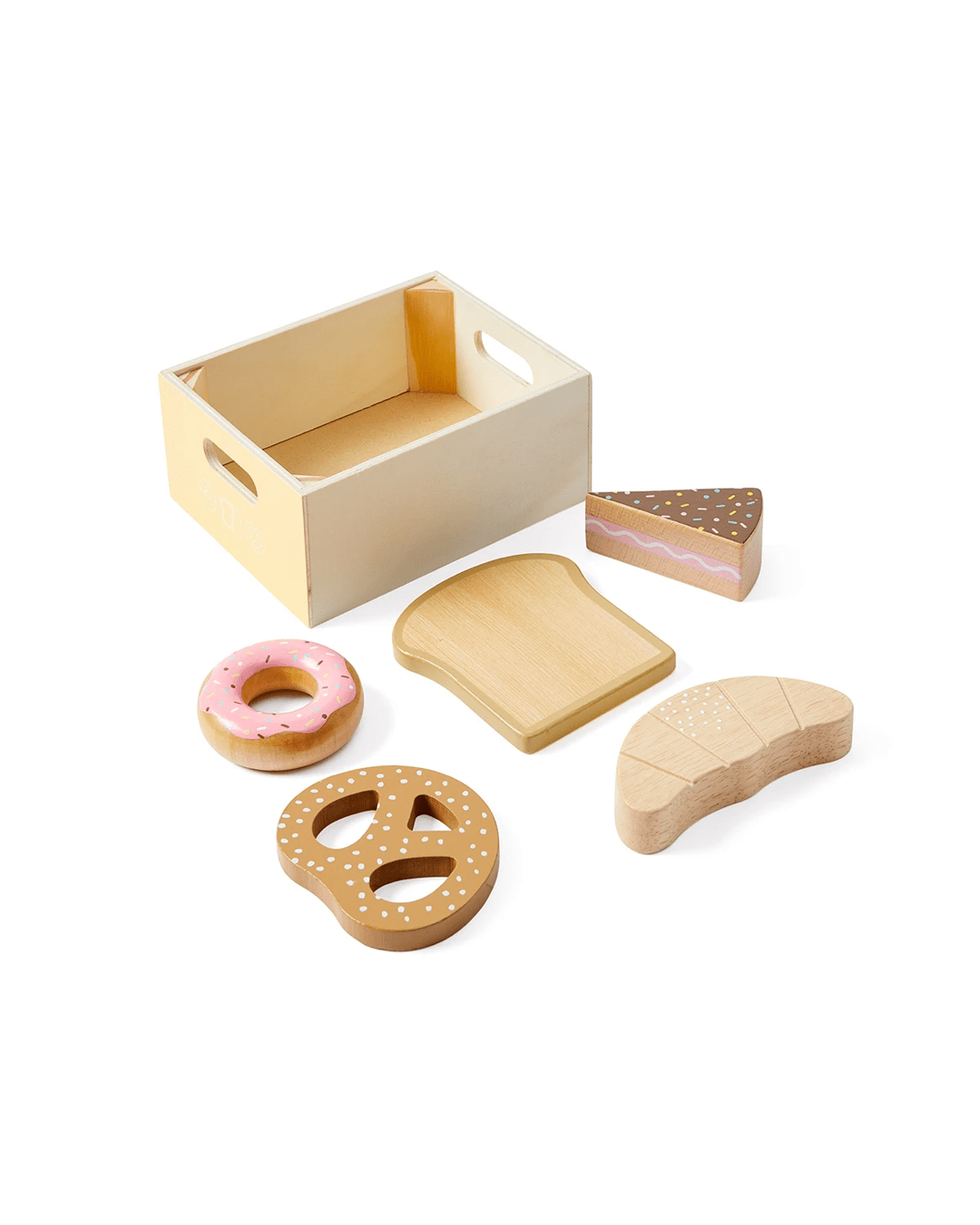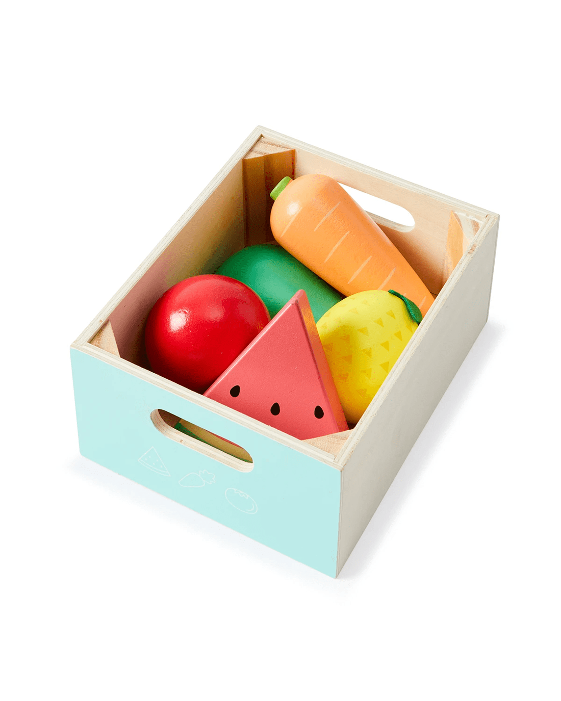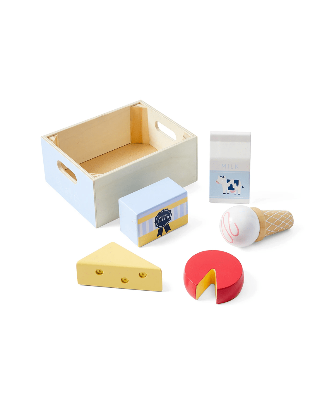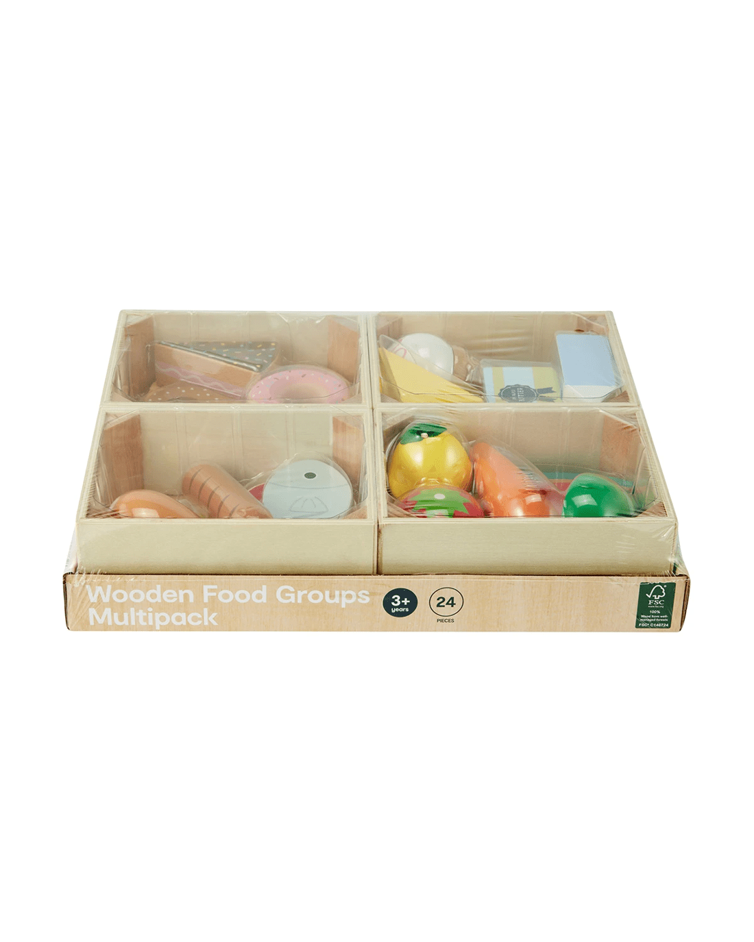 - Includes 4 x wooden boxes, 1 x pineapple, 1 x tomato, 1 x avocado, 1 x carrot, 1 x watermelon, 1 x milk carton, 1 x ice cream, 1 x cheese, 1 x cheese wheel, 1 x butter, 1 x drumstick, 1 x steak, 1 x sausage, 1 x sunny-side up egg, 1 x fish, 1 x toast, 1 x croissant, 1 x pretzel, 1 x cake and 1 x donut