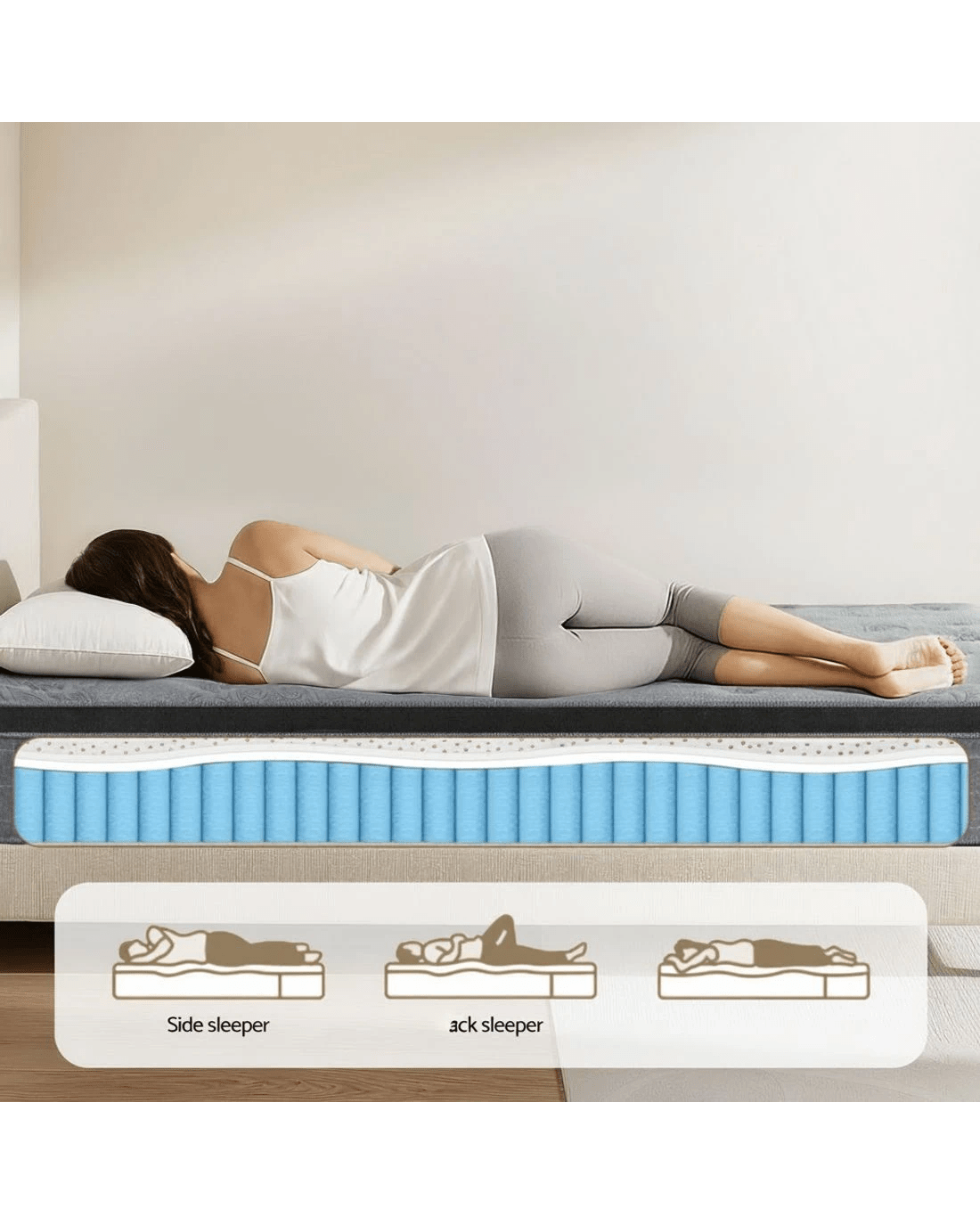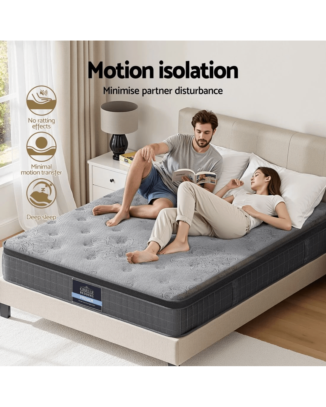 Experience balanced comfort with the Giselle Bedding DOVE Series. The 26cm profile combines natural latex foam for responsive cushioning with a bamboo charcoal fabric cover that promotes airflow. The Euro Top layer gently contours to pressure points, while high compression pocket springs and 6-turn coils provide zoned support. Reinforced edges maximise sleeping surface, and the medium-firm density suits most sleep positions.