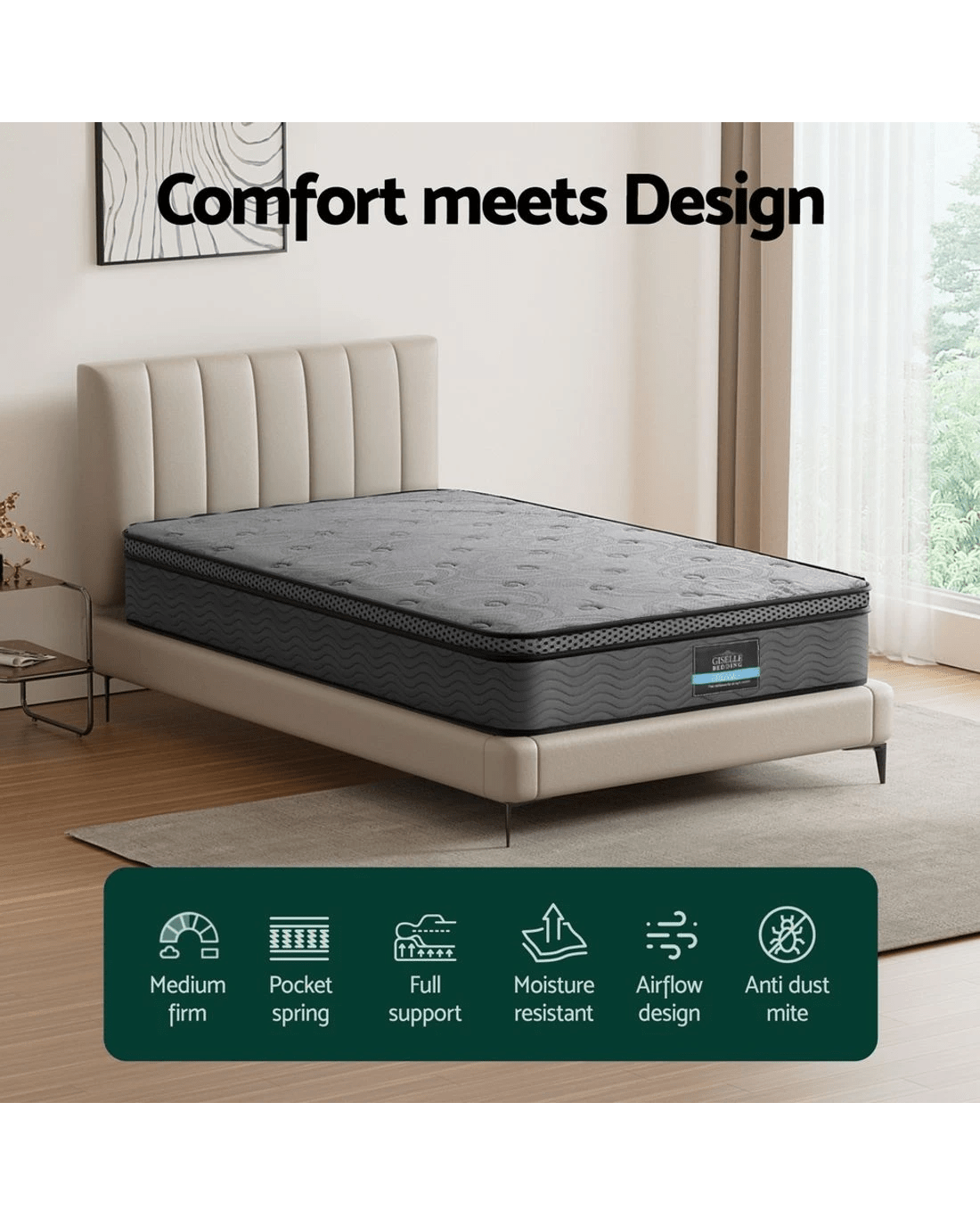 The Giselle Bedding Euro Top Mattress from the Reverie Series offers comfort and support with its 26cm thick profile. Featuring a Euro Top design, this mattress provides a plush, cushion-like surface while maintaining medium-firm support for optimal spinal alignment. The 280g knitted fabric cover is soft and breathable, promoting airflow and ensuring a cool and restful sleep. Designed with an independent coil system and pocket springs, this mattress minimizes motion transfer, allowing for uninterrupted sleep throughout the night.
