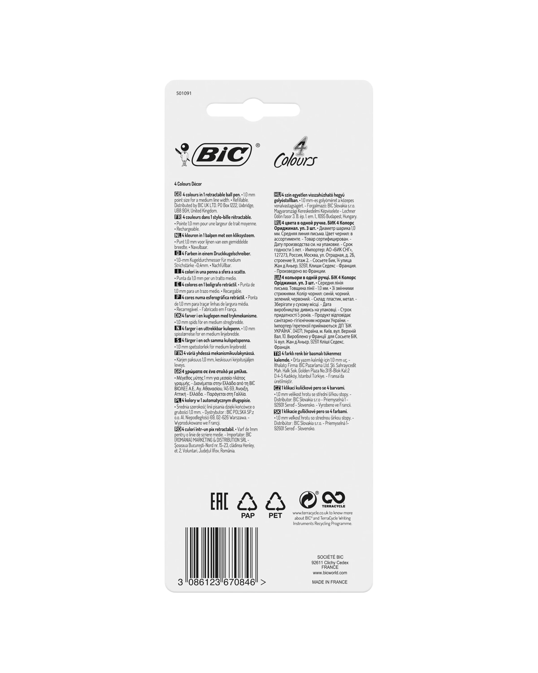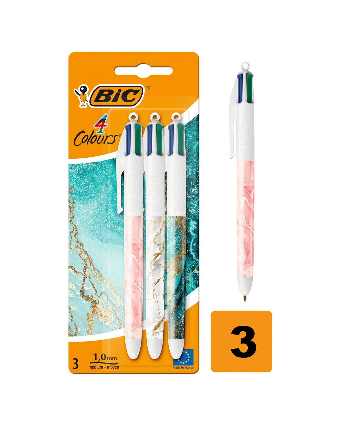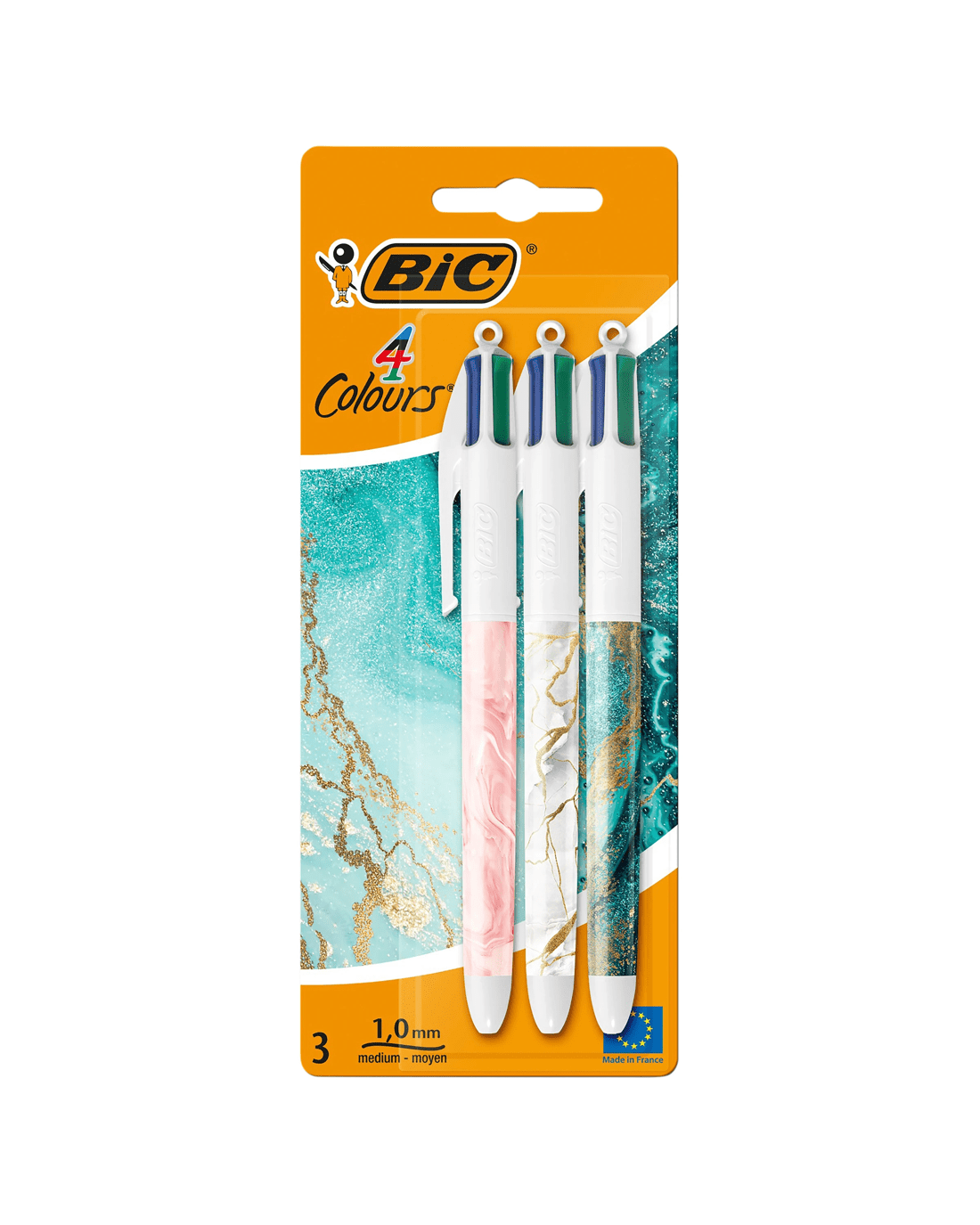 These 3 colourful barrels display trendy and sophisticated designs from the Marble collection. The BIC 4 Colours Decors retractable ballpoint pen revisits the iconic BIC 4 Colours pen in a playful and modern way. Note-taking, drawing or bullet journaling all become colourful: everything is possible thanks to the four medium points of blue, red, green and black. Designed for maximum life and manufactured in France, these refillable ballpoint pens can write 8km on average. In short, this is a classic BIC with a new look.