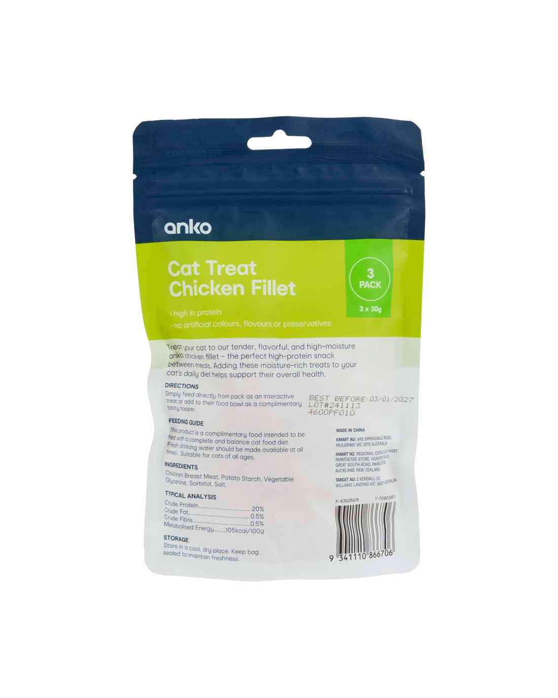 - Treat your cat to our tender, flavourful and high-moisture anko chicken fillet - the perfect high-protein snack between meals. Adding these moisture-rich treats to your cat's daily diet helps support their overall health