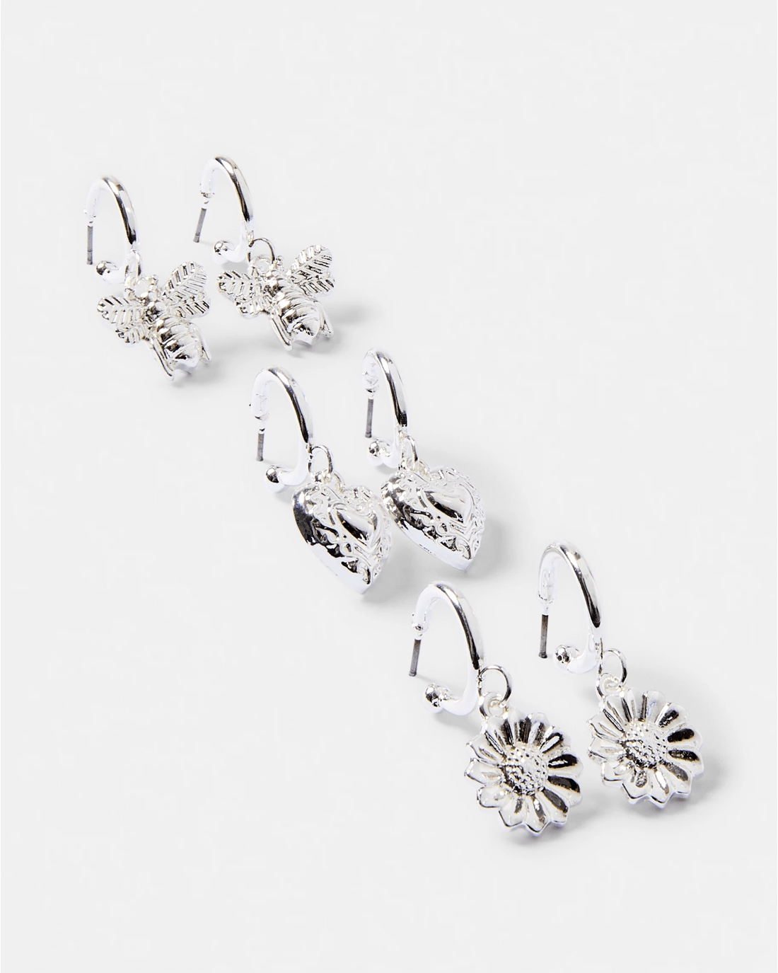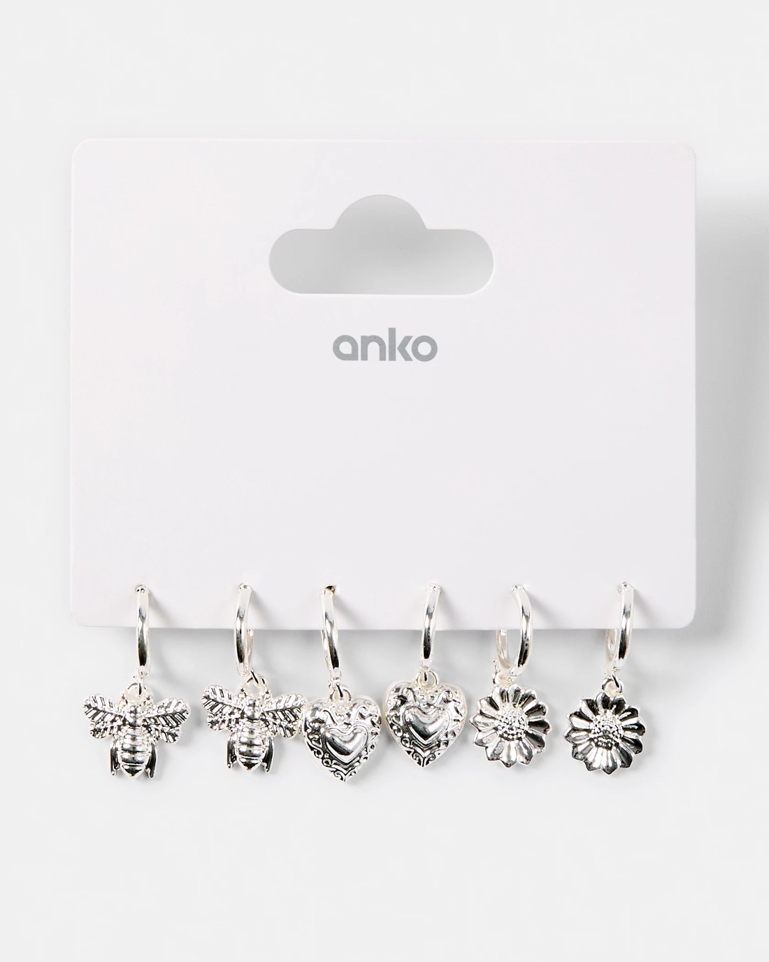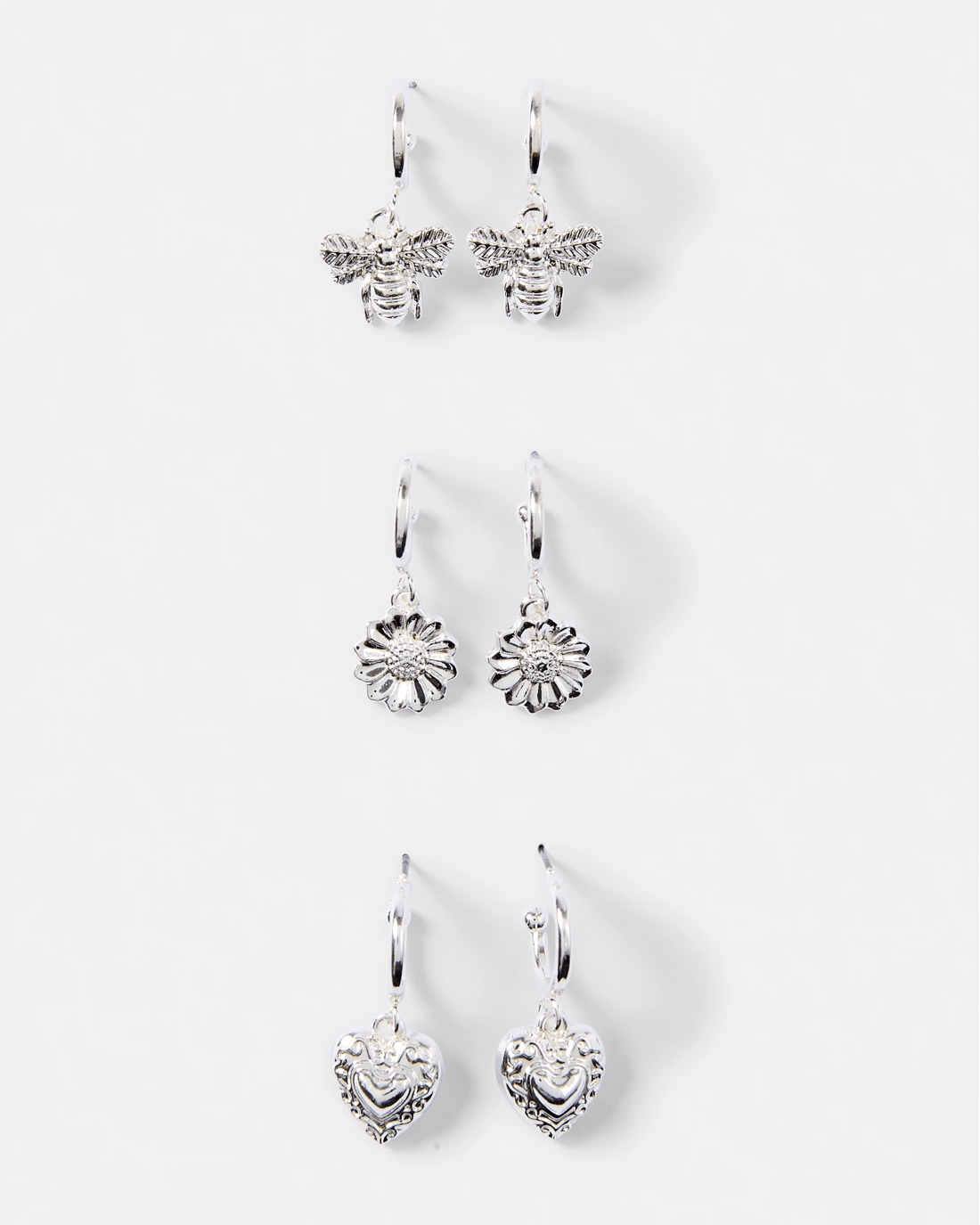 3 Pack Flower, Bee and Heart Earrings - Silver Tone