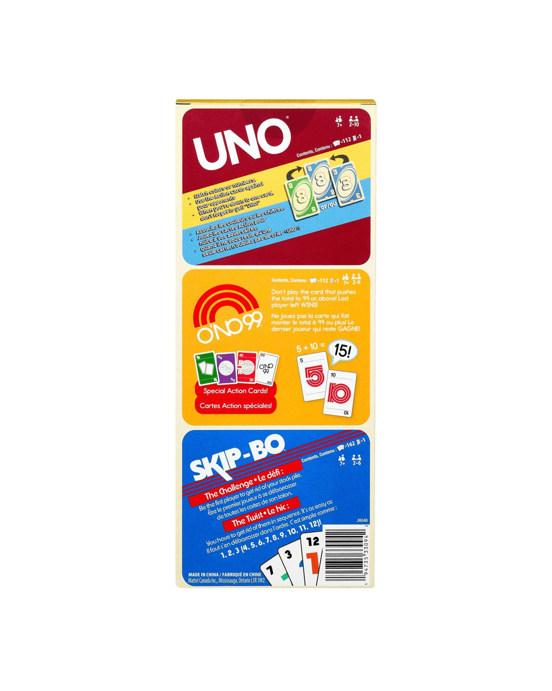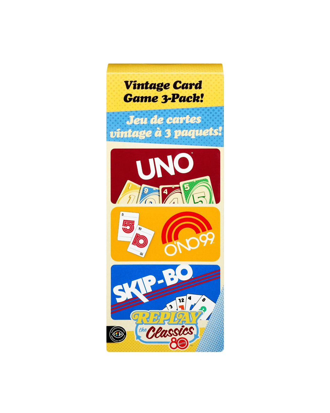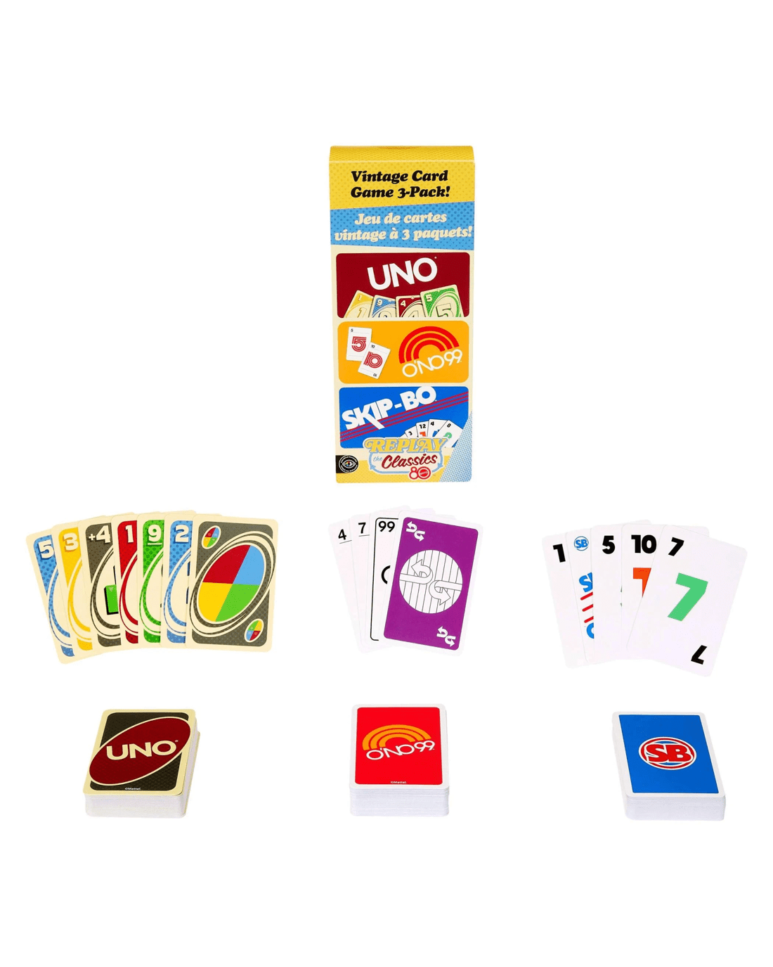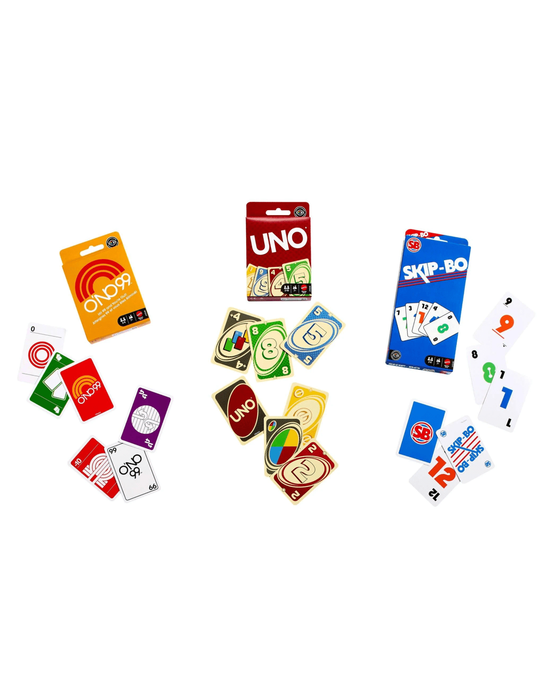 Rediscover the joy of classic card games with this charming Mattel 3 Pack Vintage Card Game set. Whether you’re matching colours and numbers in UNO, strategising in O'NO 99, or racing to clear your cards in Skip-Bo, each game is sure to spark friendly competition and laughter. The retro-inspired graphics bring a nostalgic feel to your gatherings, making every game night extra special with friends or family. With three timeless titles bundled together, everyone can find their favourite way to play. Bring home this delightful set to make your next gathering memorable and let the fun begin! Ready to deal in the good times? Add this to your collection today.Features
