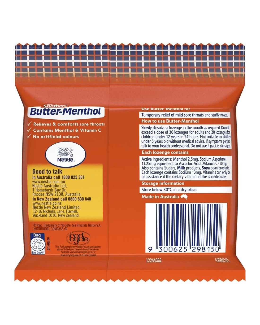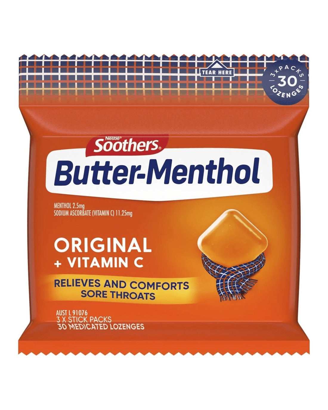 Soothers Butter-Menthol medicated throat lozenges provide comforting throat relief by combining mild Menthol with a great distinctive taste that Australians know and love. They help relieve symptoms of common colds and flu, including dry and irritated throats and nasal congestion. Also with the added goodness of Vitamin C, these throat lozenges contain no artificial colours. Each pack contains thirty individually wrapped lozenges, conveniently packed in three sticks of ten, perfect to take on the go.