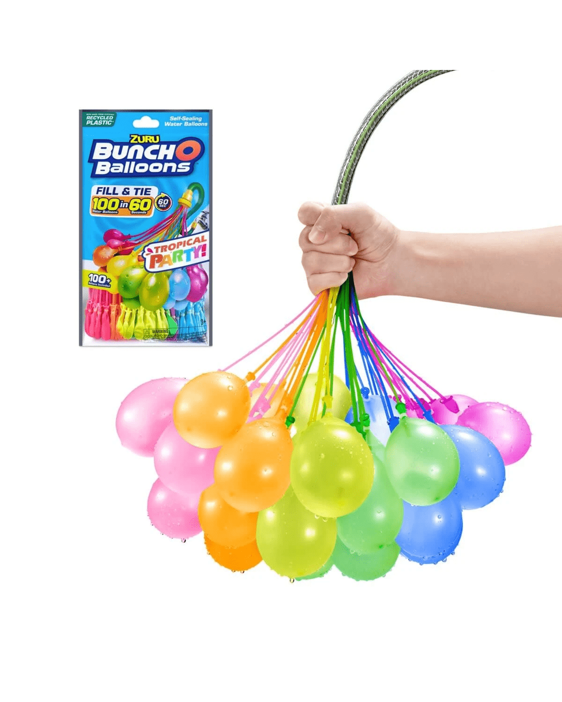 - Quick fill: Splash into summer with Bunch O Balloons. Fill and Tie 100 balloons in 60 seconds to start a Tropical Party in minutes! Simply attach the stem to a hose and make hundreds of water balloons in seconds