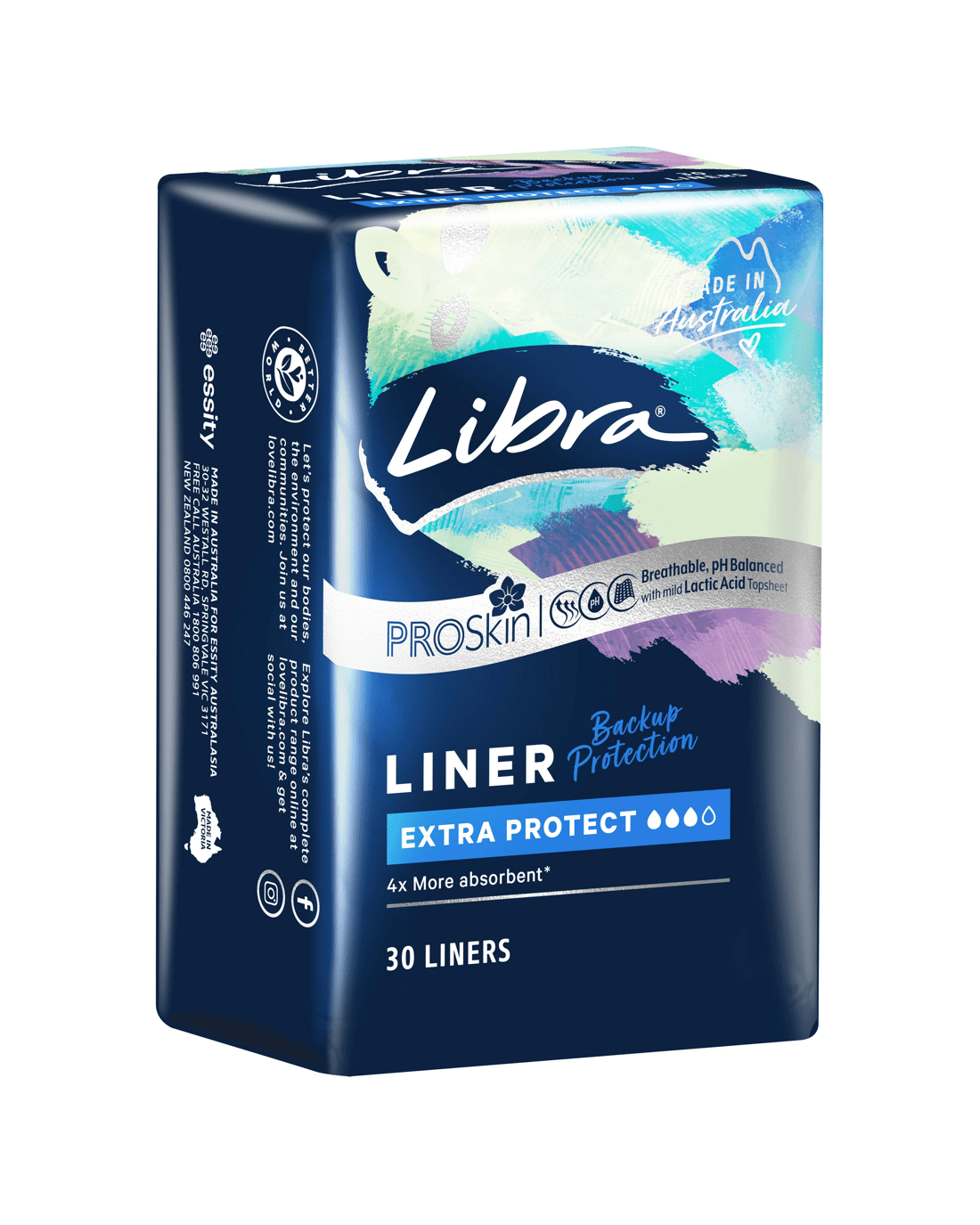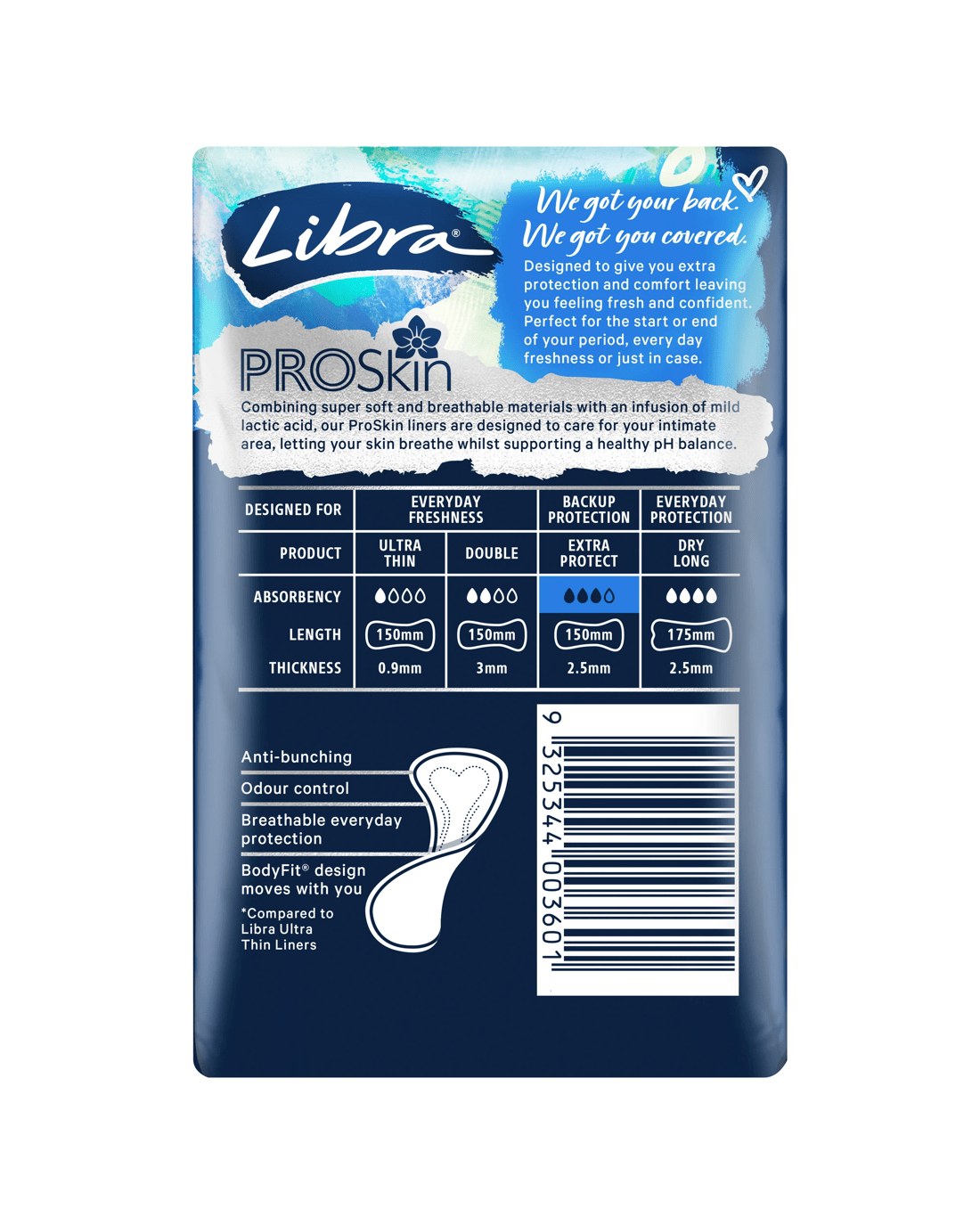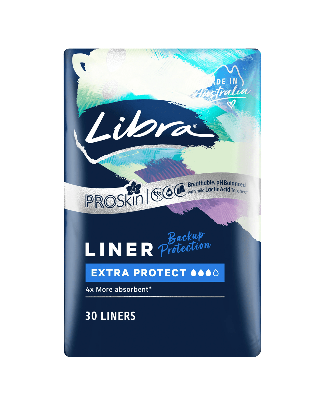 Libra Extra Protect Liners for extra backup. These liners are designed to give you extra protection and on-the-go freshness. Incredibly breathable and comfortable, they are four times more absorbent than Libra Ultra Thin Liners. With our odour control technology, you will feel secure and fresh throughout the day. Designed with anti-bunching technology and our unique BodyFit shape, this liner moulds to your body like a second skin for reliable protection that moves with you. With over 40 years experience Libra is here to support you through every moment of your cycle.