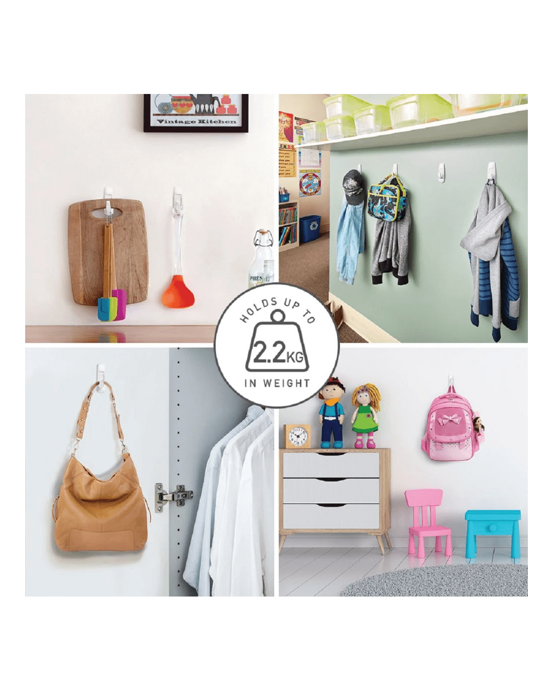 - Each hook has a weight capacity of 2.2 kg.