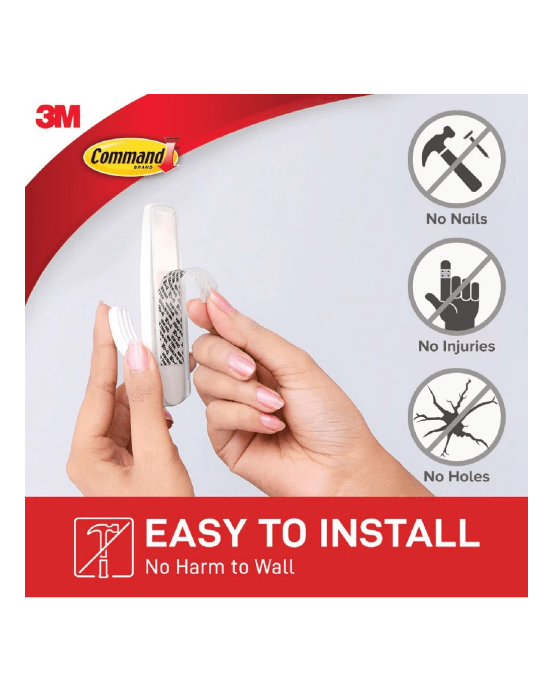 These 3M Command Hooks can be adhered to a variety of surfaces including paint, wood, tile and more. They each come with adhesive strips which hold strongly but can be removed without leaving any residue behind.