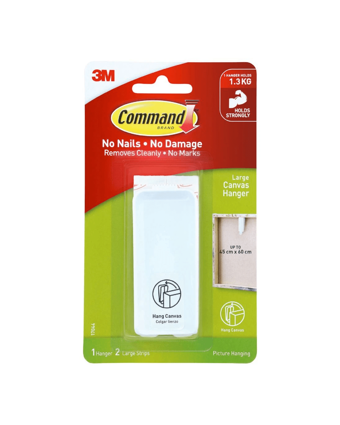This 3M Command Large Canvas Hanger was especially designed to sit under and behind the frame of canvas. It can be adhered to a variety of surfaces including paint, wood, tile and more. It comes with adhesive strips which hold strongly but can be removed cleanly without leaving any residue behind.