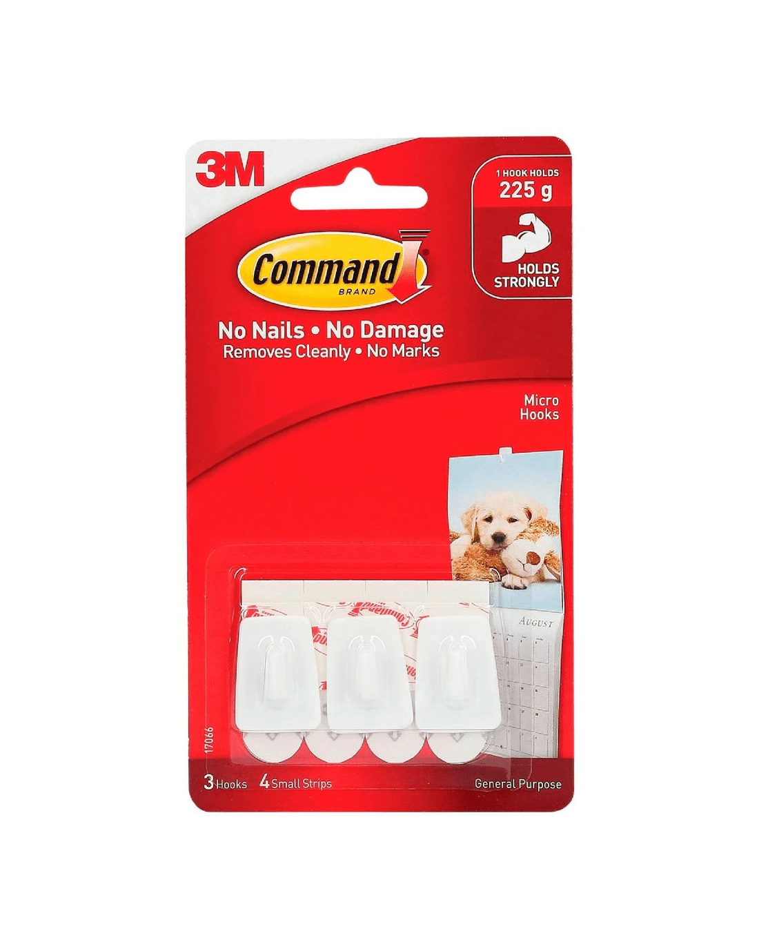 3M Command Micro Hooks hold strongly and remove cleanly leaving no residue behind. Each hook holds up to 225 g and is ideal for use at home, school or the office. They are great for holding up calendars, important files and any other similar small items.