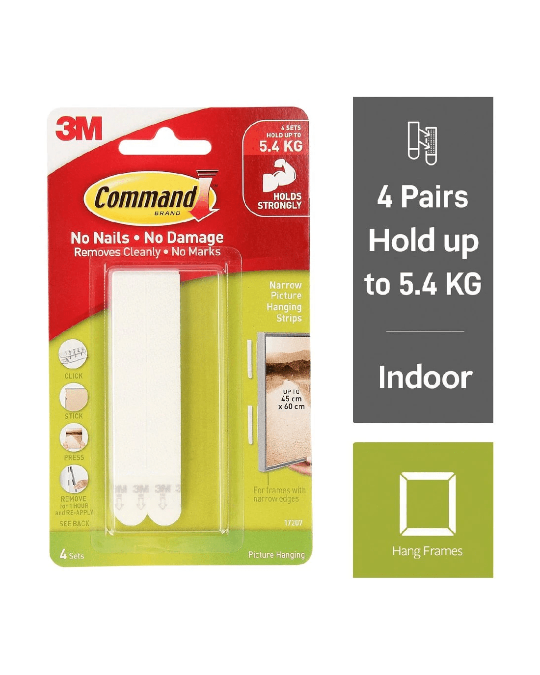 These 3M Command Narrow Picture Hanging Strips can be used to display your frames, photos and prints. They can adhere to a variety of surfaces including paint, wood, tile and more. They will hold strongly once applied but remove cleanly when you decide it's time for a change.