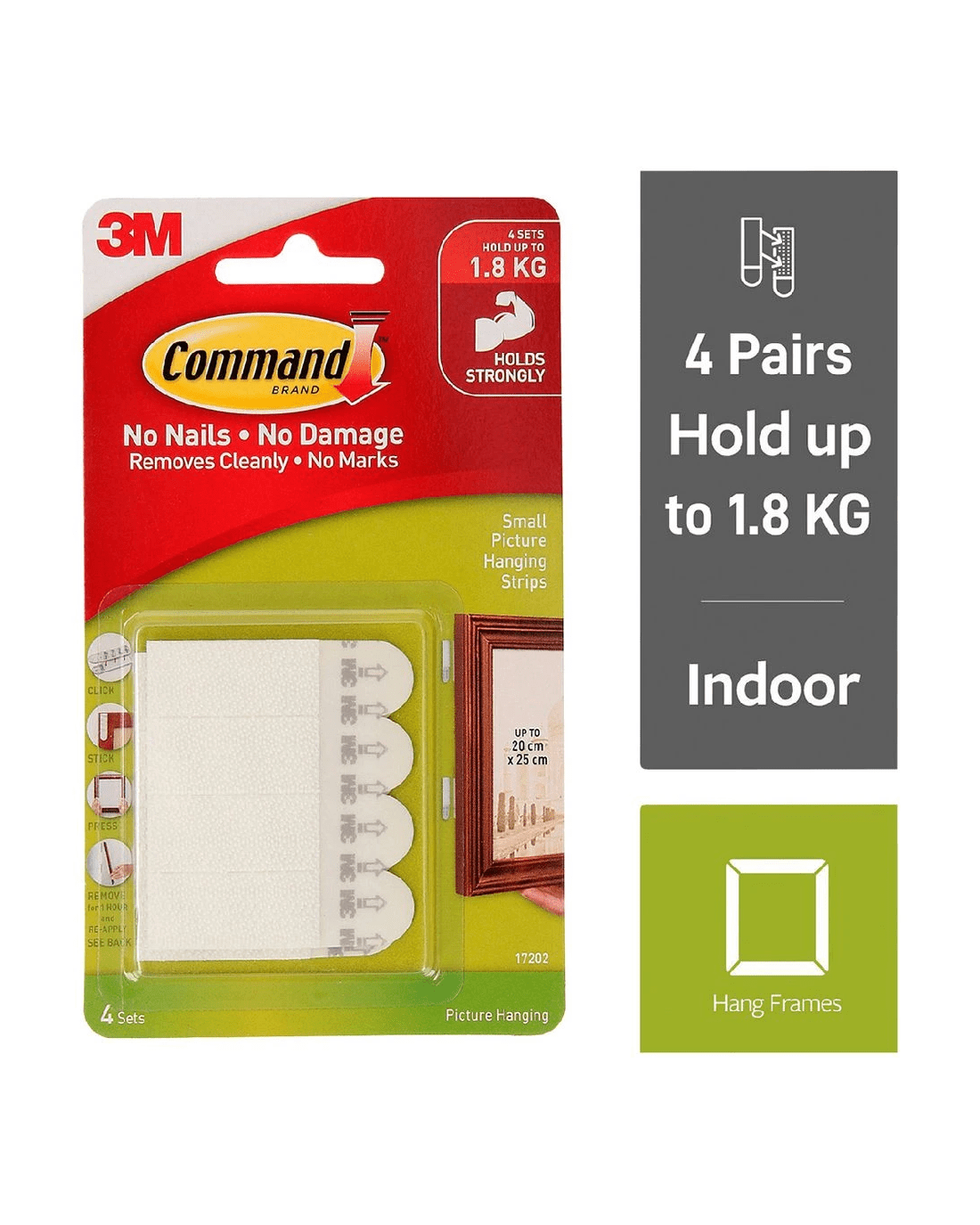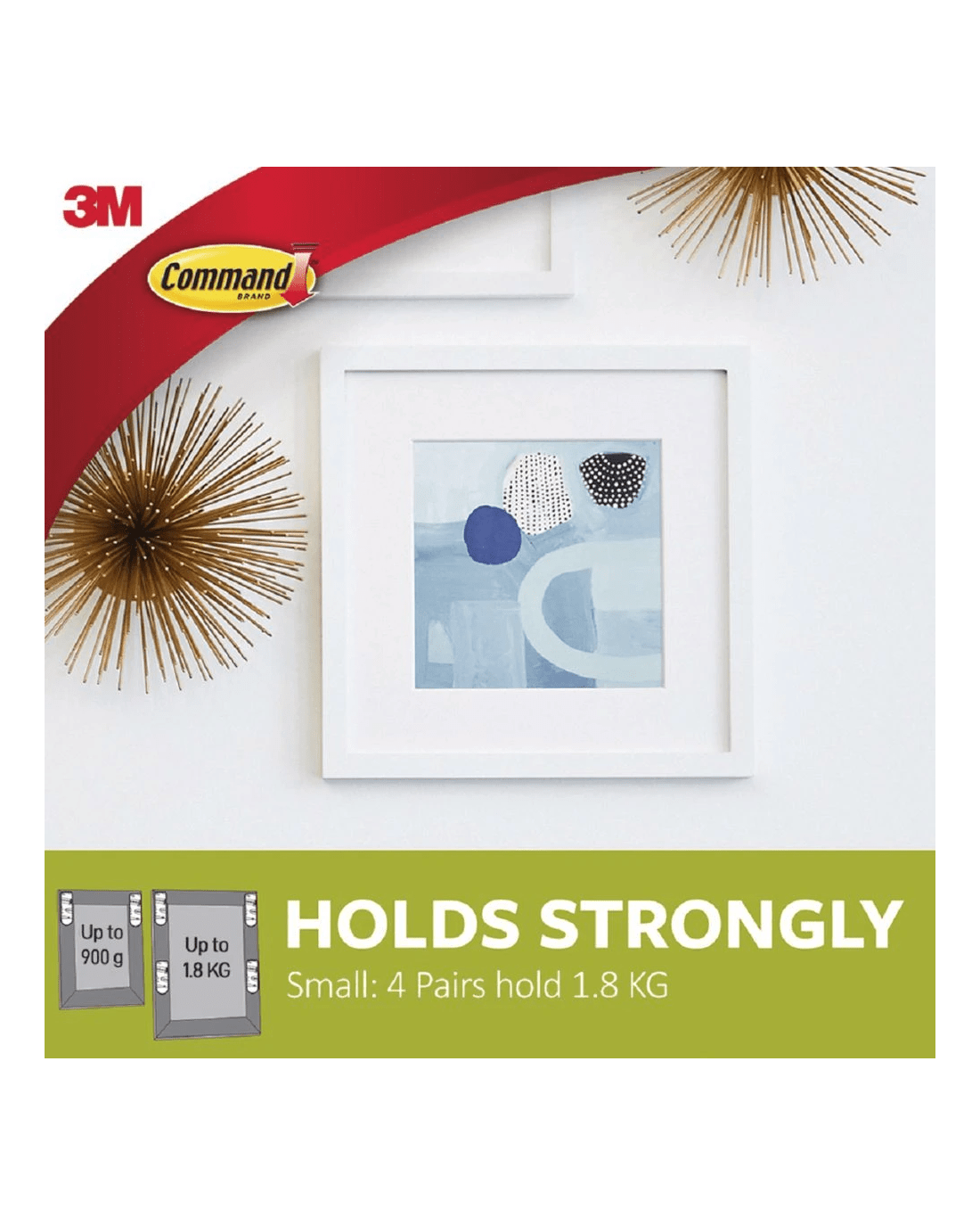 3M Command Small Picture Hanging Strips hold up to 1.8 kg and are recommended for frames up to 20 x 25 cm. They have a convenient design, are easy to apply, easy to remove and leave no residue.