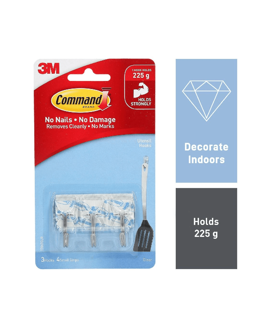 - The pack contains 3 clear hooks and 4 small clear mounting strips.