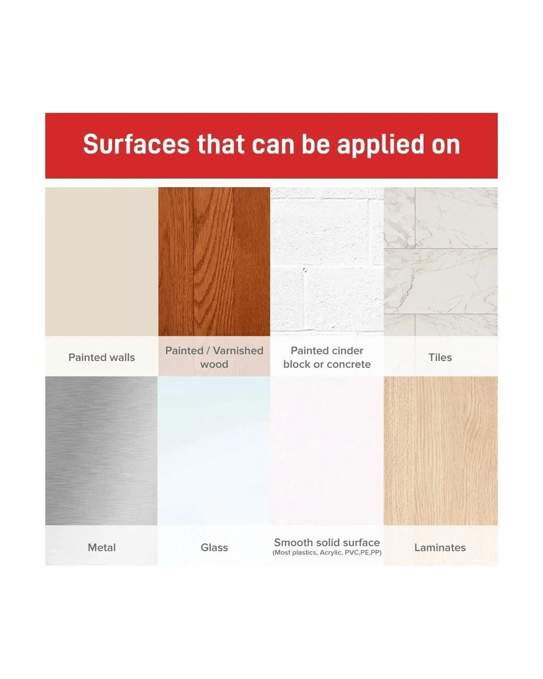 - Works on a variety of indoor surfaces, such as painted Gyprock, finished wood, tile, metal and glass