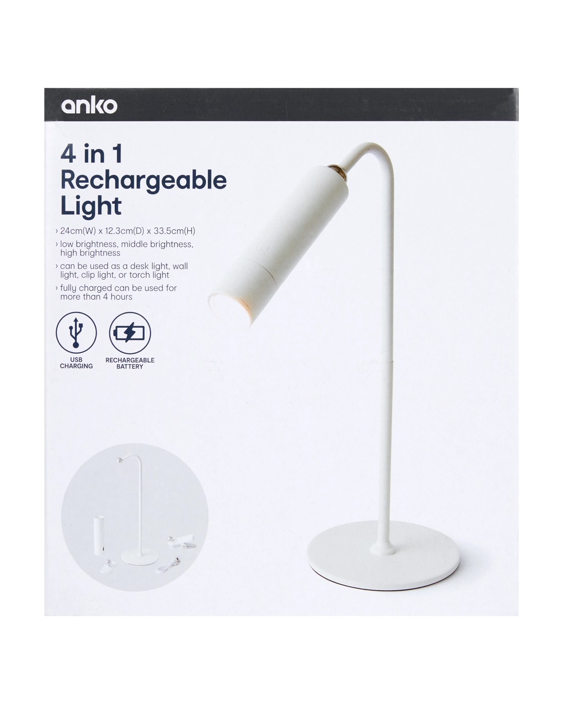 Illuminate any space with 4-in-1 Rechargeable Light that combines multiple lighting modes into one handy design. Easy to charge and use anywhere, it's perfect for adding bright, flexible light where you need it most.