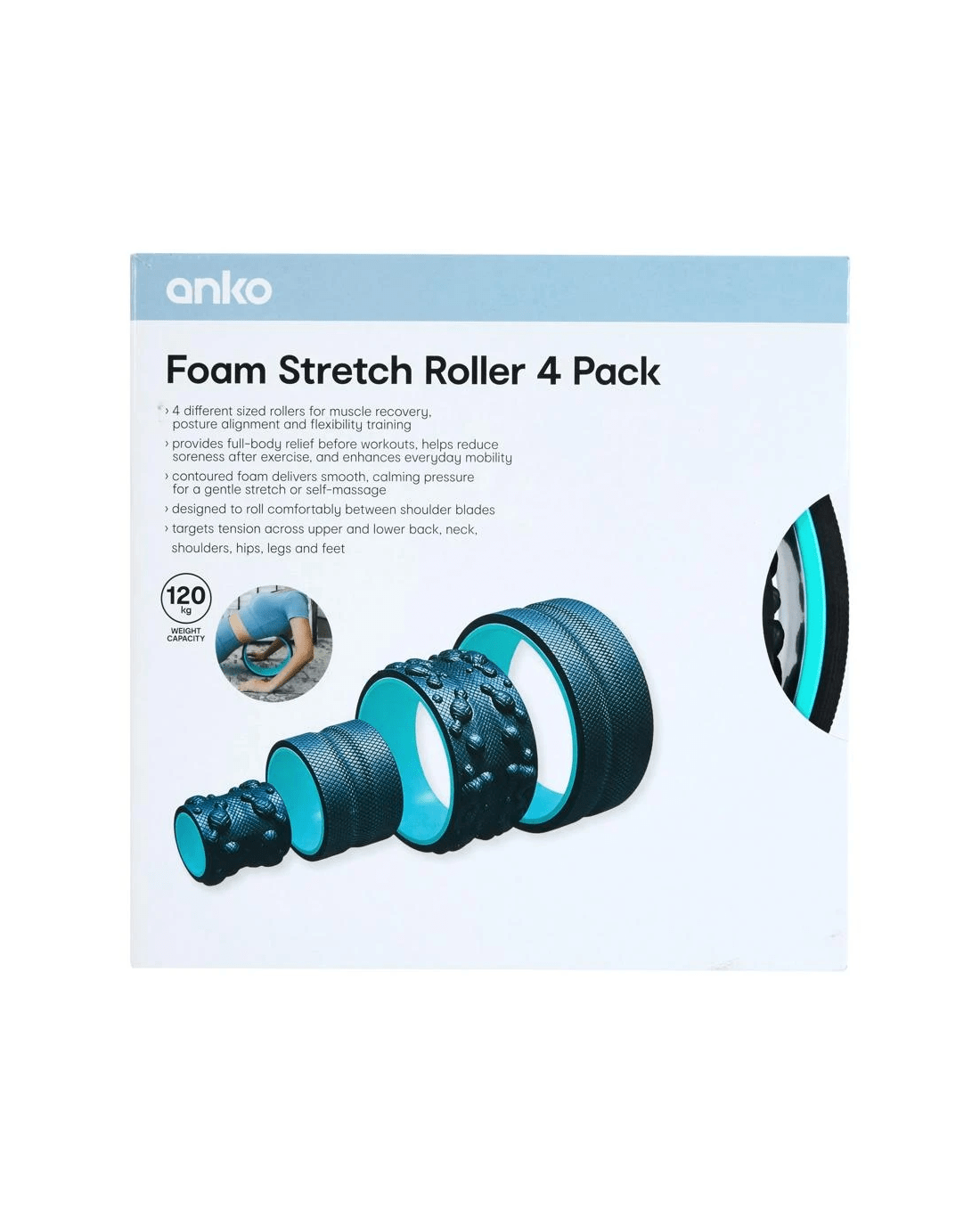 - 4 different sized rollers for muscle recovery, posture alignment and flexibility training
