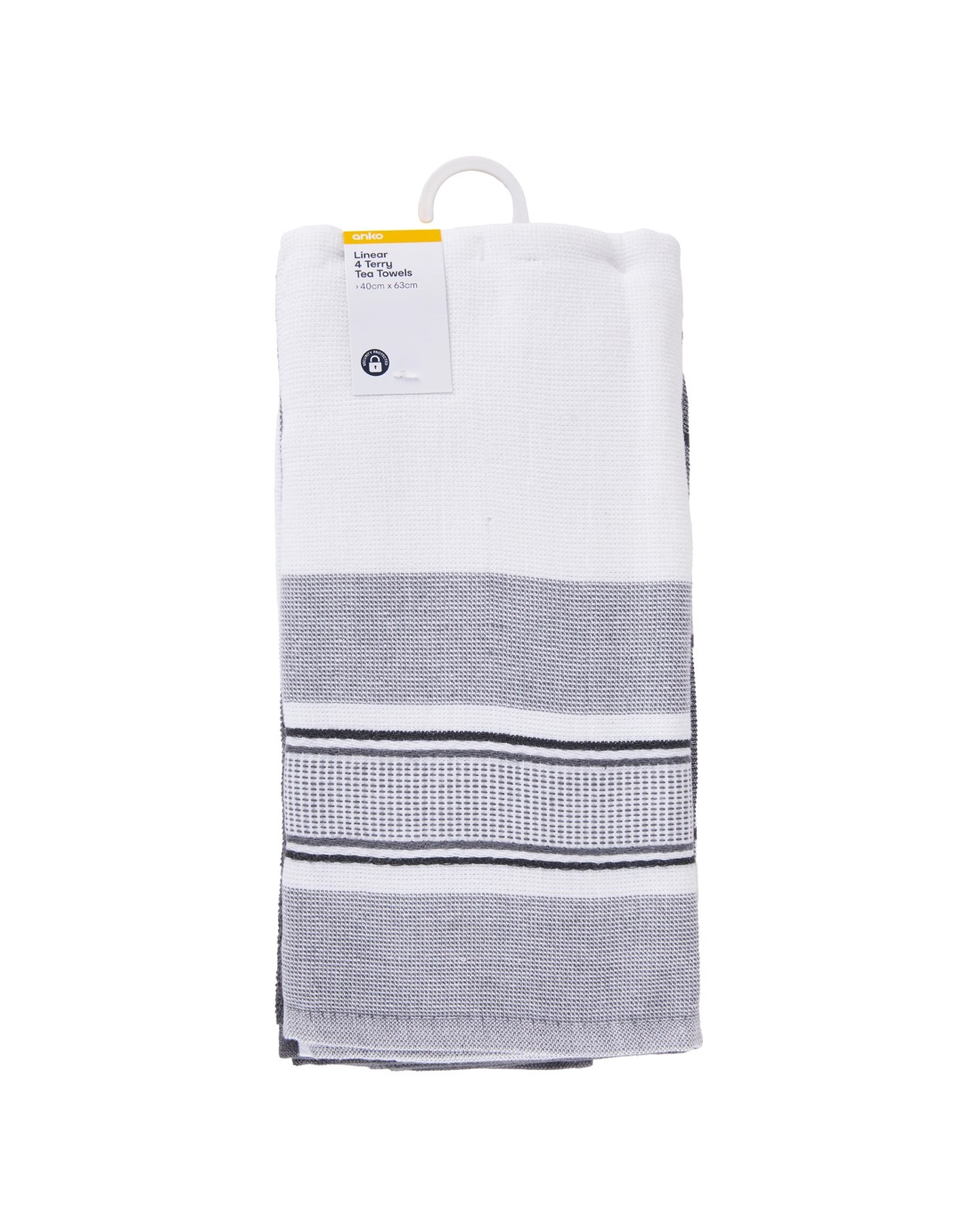 Add style and function with this 4 Pack Grey Linear Terry Tea Towels. Absorbent and versatile, these towels are perfect for everyday drying, cleaning and decorative kitchen charm.