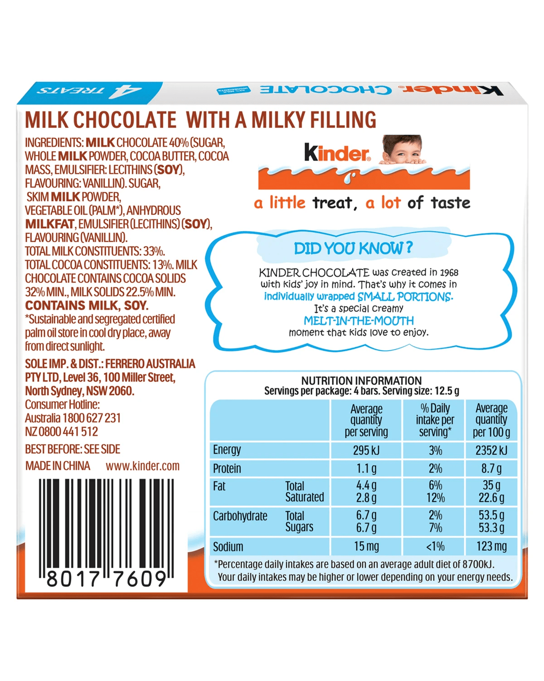 Features- Kinder chocolate was created in 1968 with kids' joy in mind. That's why it comes in individually wrapped small portions.