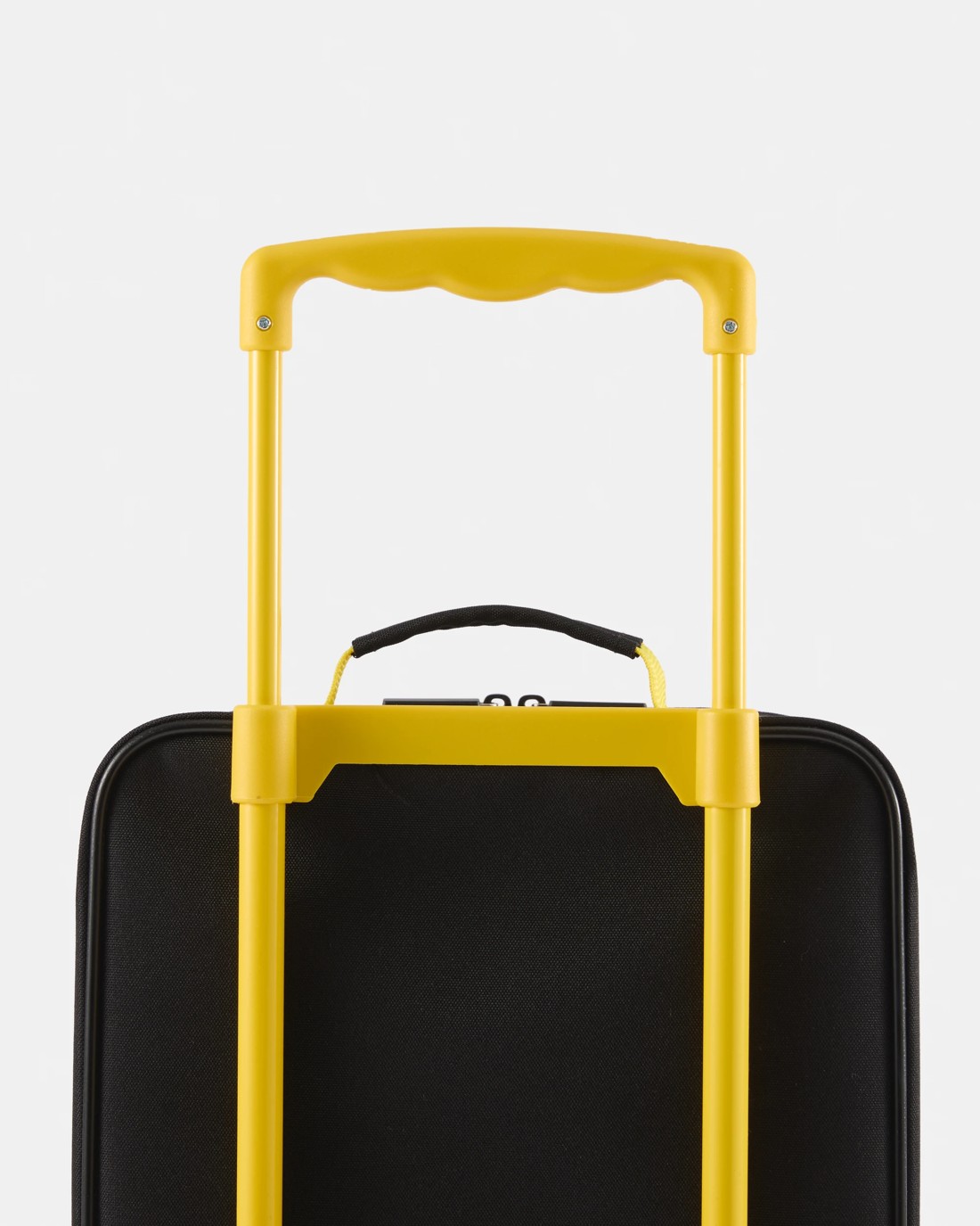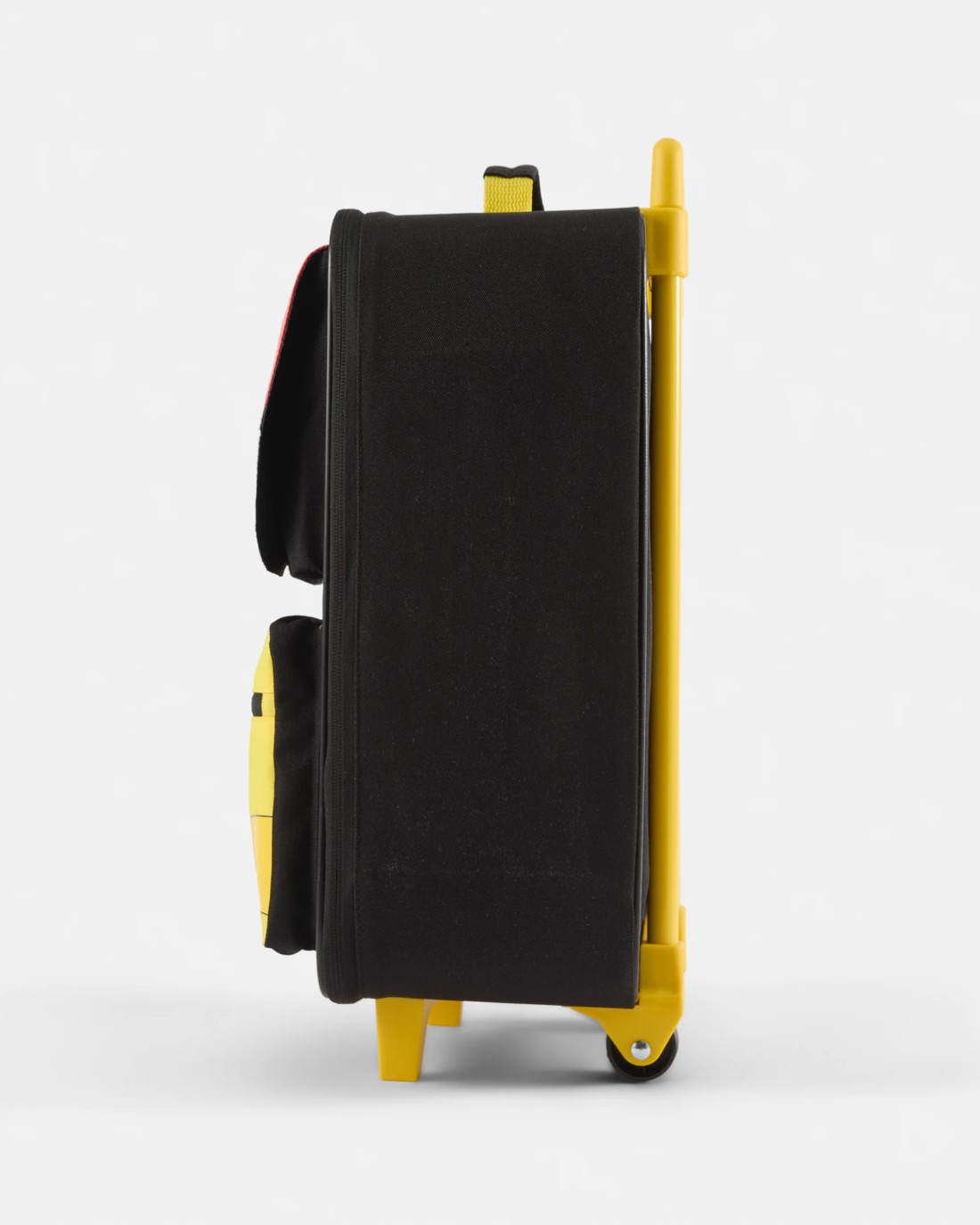 - Rolling luggage: Rectangular shape, retractable carry handle, 1 main compartment, 3 front pockets, 2 wheels and zip closure
