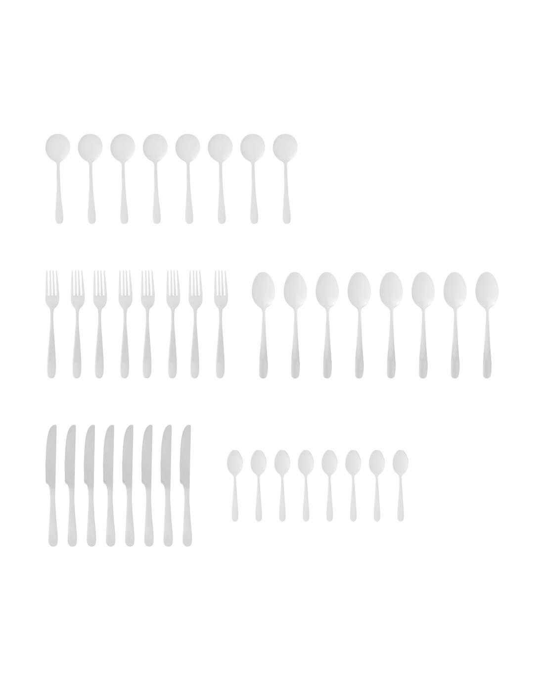- Includes 8 x knives, 8 x forks, 8 x spoons, 8 x teaspoons and 8 x soup spoons