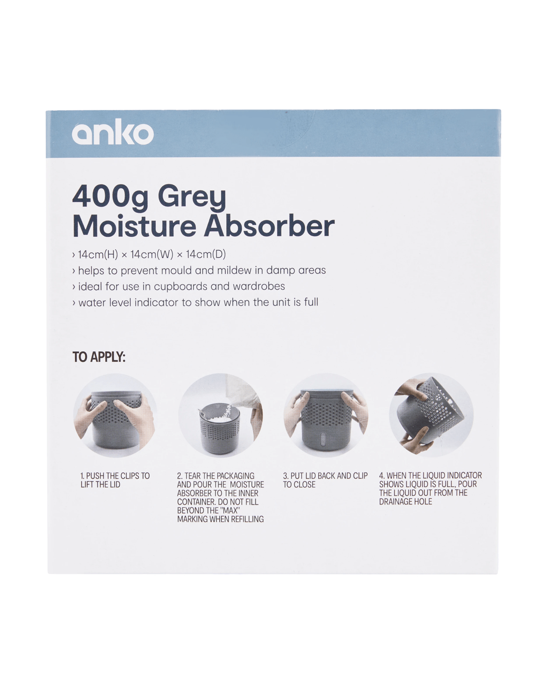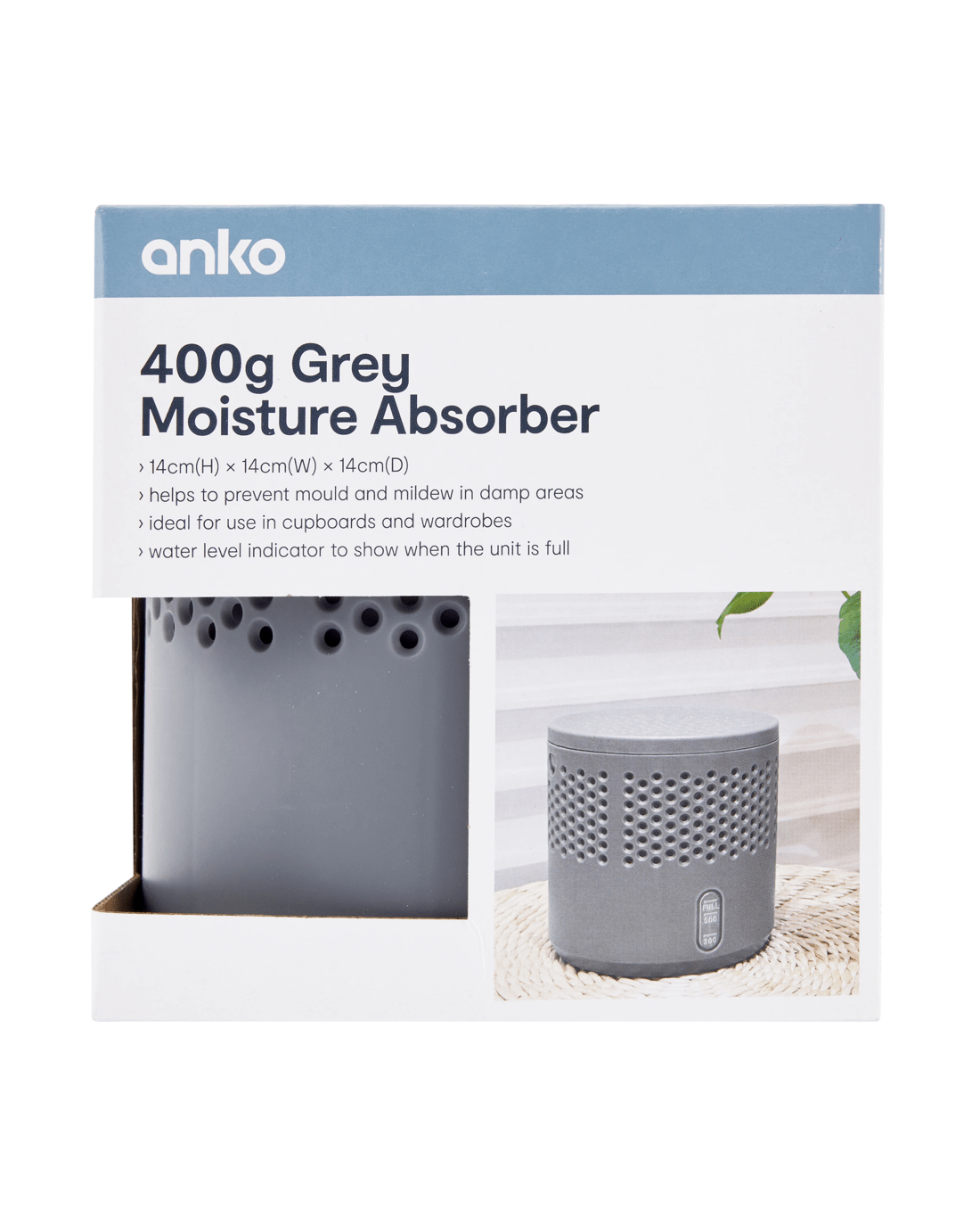 Help reduce dampness in small spaces with the 400g Grey Moisture Absorber - a compact option for tackling moisture in cupboards, wardrobes or storage areas.
