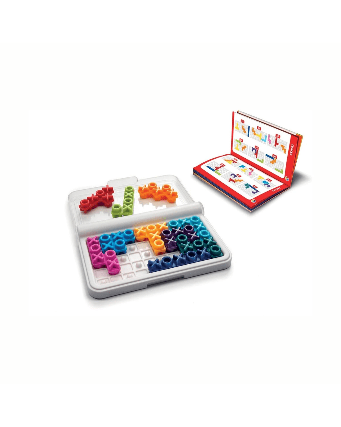 • Includes 1 compact game board with transparent lid, 10 colourful puzzle pieces, and 1 booklet with 120 challenges and solutions