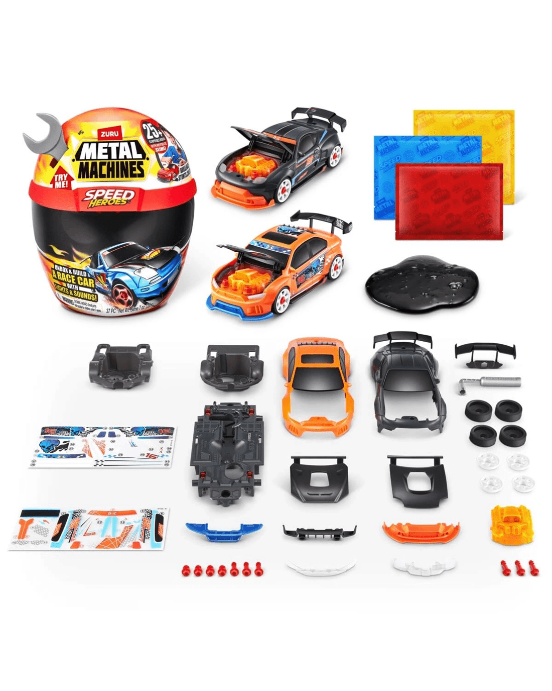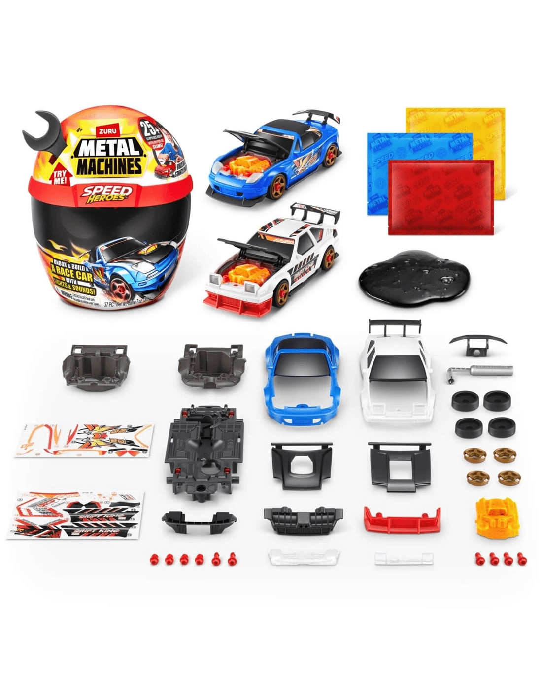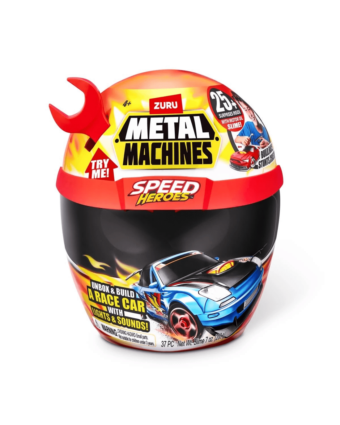 Jump into the driver’s seat of your own custom race car with Metal Machines Speed Heroes! Break open the race helmet to discover more than twenty surprises inside to build your very own custom race car. Customise the design and body of the race car as you build! Watch your custom speed hero come to life with lights and sounds. Challenge your friends to races and see which Speed Hero will dominate the race track!