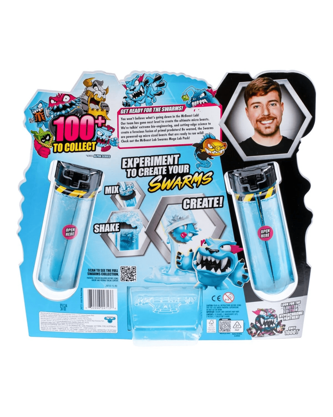 With over 85 unique 1-inch (2.5 cm) MrBeast Swarms characters to collect—including the rare and coveted Silver Mystery Case—adventure and discovery are just a shake away. But act fast; only 1,000 Silver Mystery Cases are available in this NEW Atomic Series! Each Micro Beast belongs to its own distinct team, such as the spine-chilling Home Horrors or the electrifying Techno Terrors. Which team will you complete first? Embrace the chaos! Mix, shake and embark on an exhilarating experiment with the all-new MrBeast Lab Swarms Atomic Series!