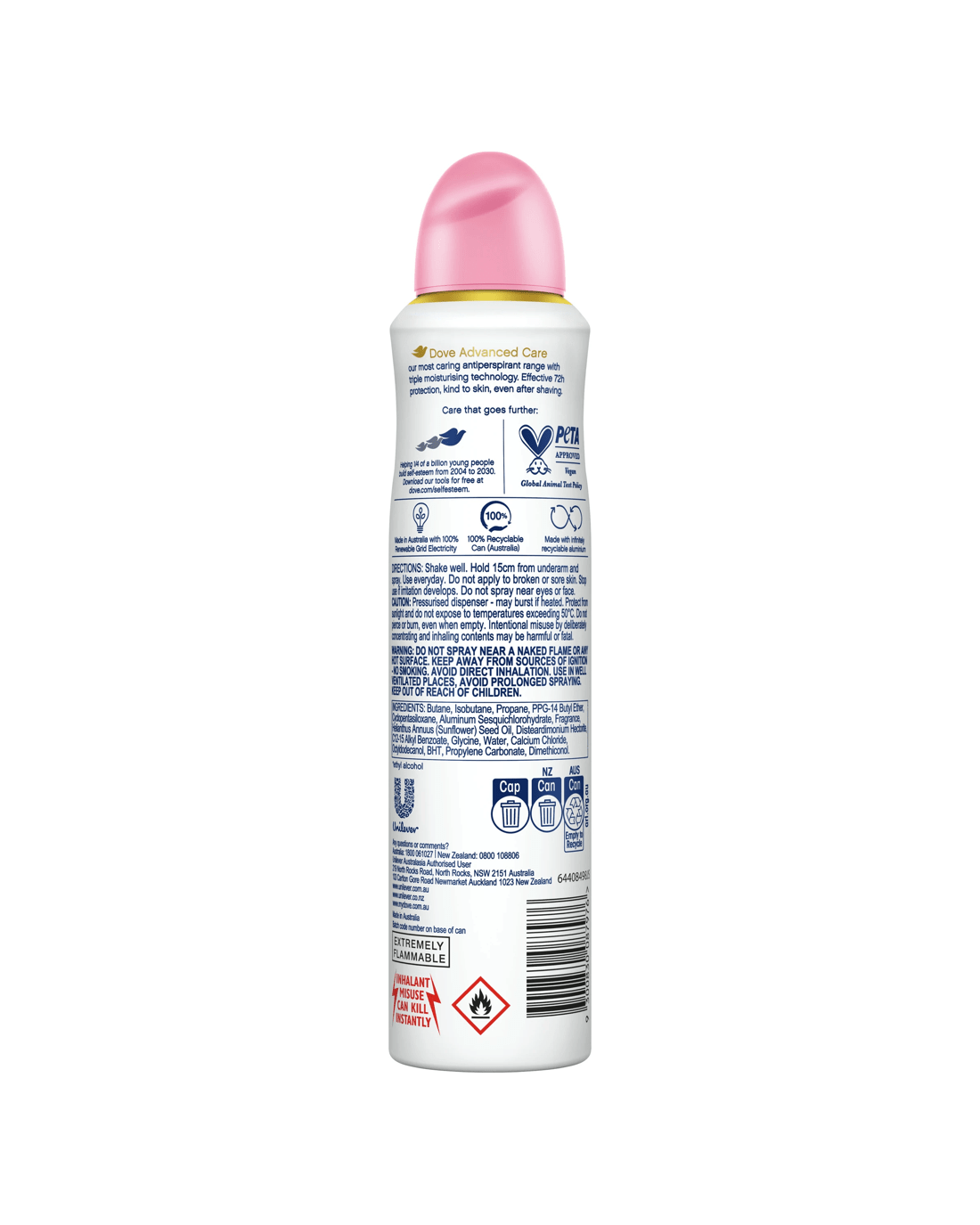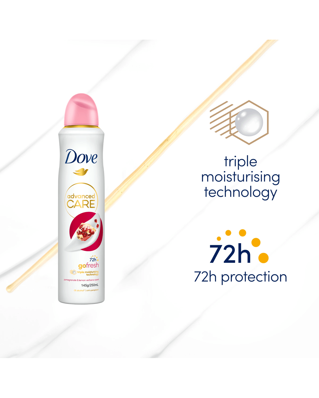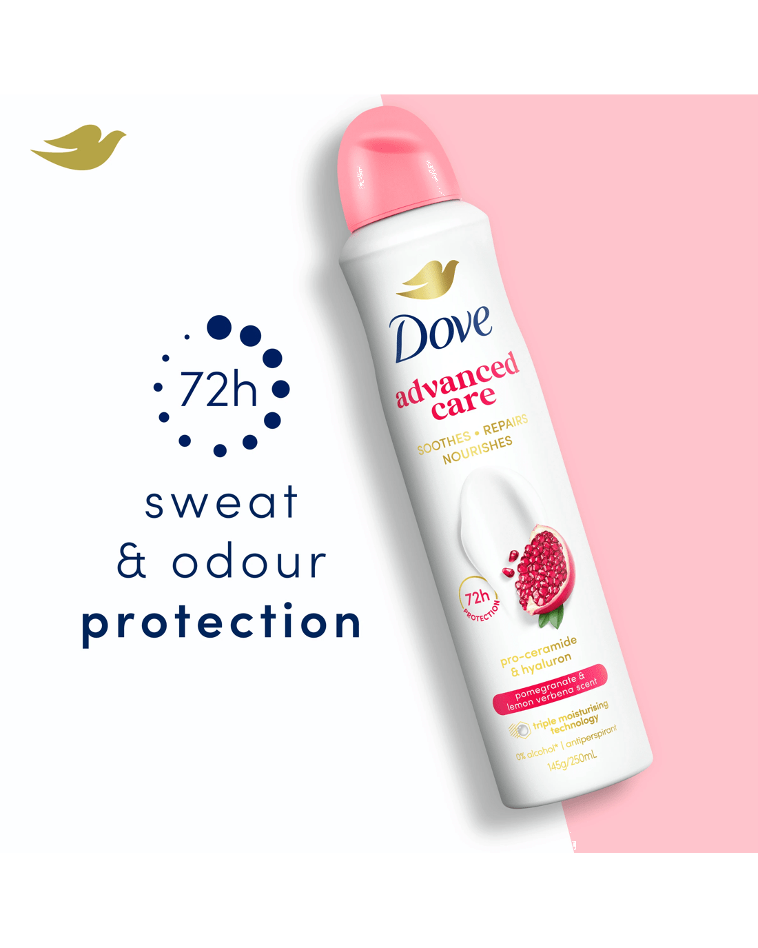 Long-lasting antiperspirant protection, an extra dose of care and a refreshing fruity scent – who says you can’t have it all? Try Dove Advanced Care Go Fresh Pomegranate & Lemon Verbena Antiperspirant Deodorant Aerosol. Dove Advanced Care is our most caring antiperspirant range, enhanced with revolutionary triple moisturising technology for soft and smooth underarm skin, even after shaving. This deodorant spray helps boost your skin’s moisture barrier and reduce underarm irritation caused by shaving. As much as it cares for your skin, our spray deodorant doesn’t compromise antiperspirant protection. The alcohol-free* formula keeps odour and sweat at bay for up to 72 hours to make you feel beautifully confident all day and night. Infused with a crisp pomegranate and lemon verbena scent, this antiperspirant deodorant is your instant pick-me-up. How to use: For best results, shake well, then spray in short bursts in a well-ventilated area, holding the can 15 cm away from your underarm. Use every day. Do not apply to broken or sore skin. At Dove, we believe no young person should be held back from reaching their full potential. Since 2004, we’ve been building self-esteem and confidence in young people – and by 2030, we’ll have helped a quarter of a billion young people through our educational programmes and resources.