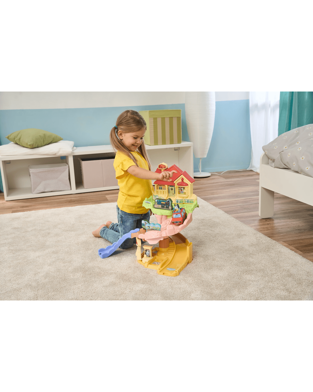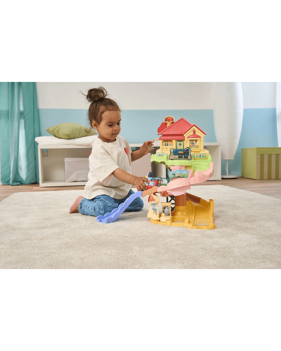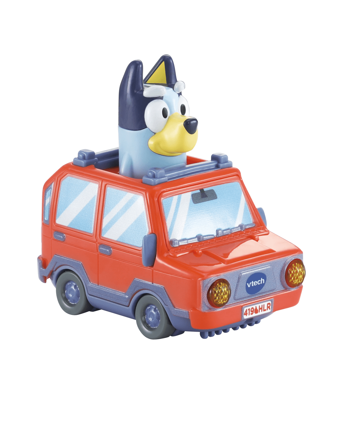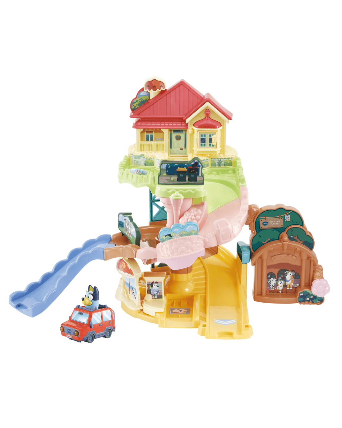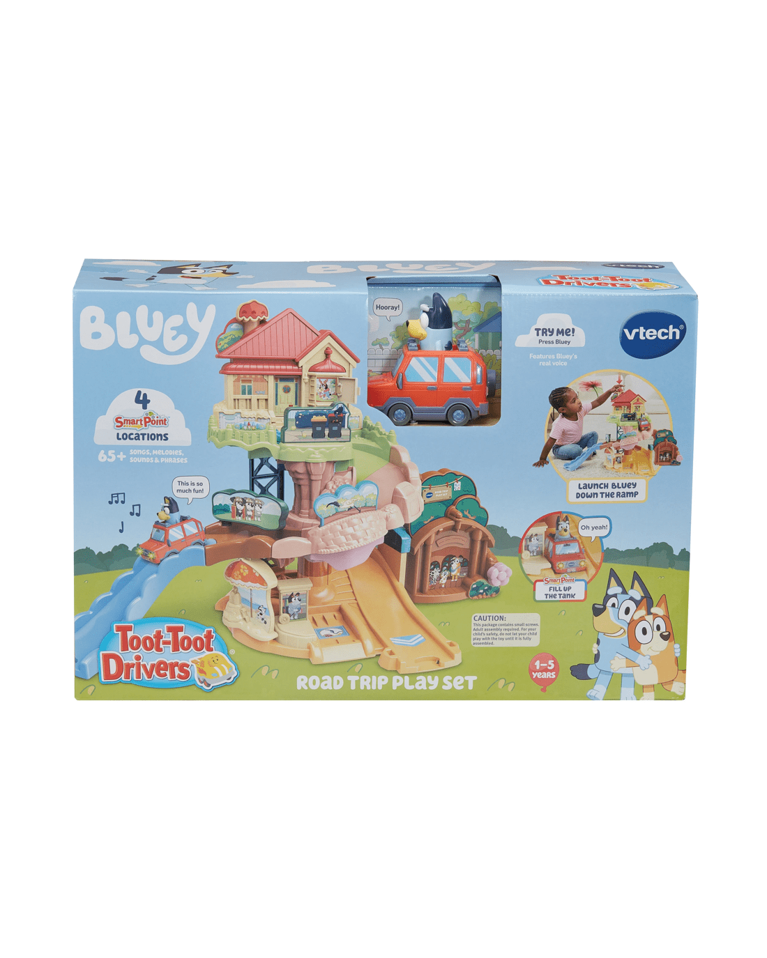 Travel around with Bluey!! Drive from the Heeler House to the beach, school and more! Zoom past favourite characters and moments from the show while listening to Bluey talk by pressing her head button or driving over the four SmartPoint locations.