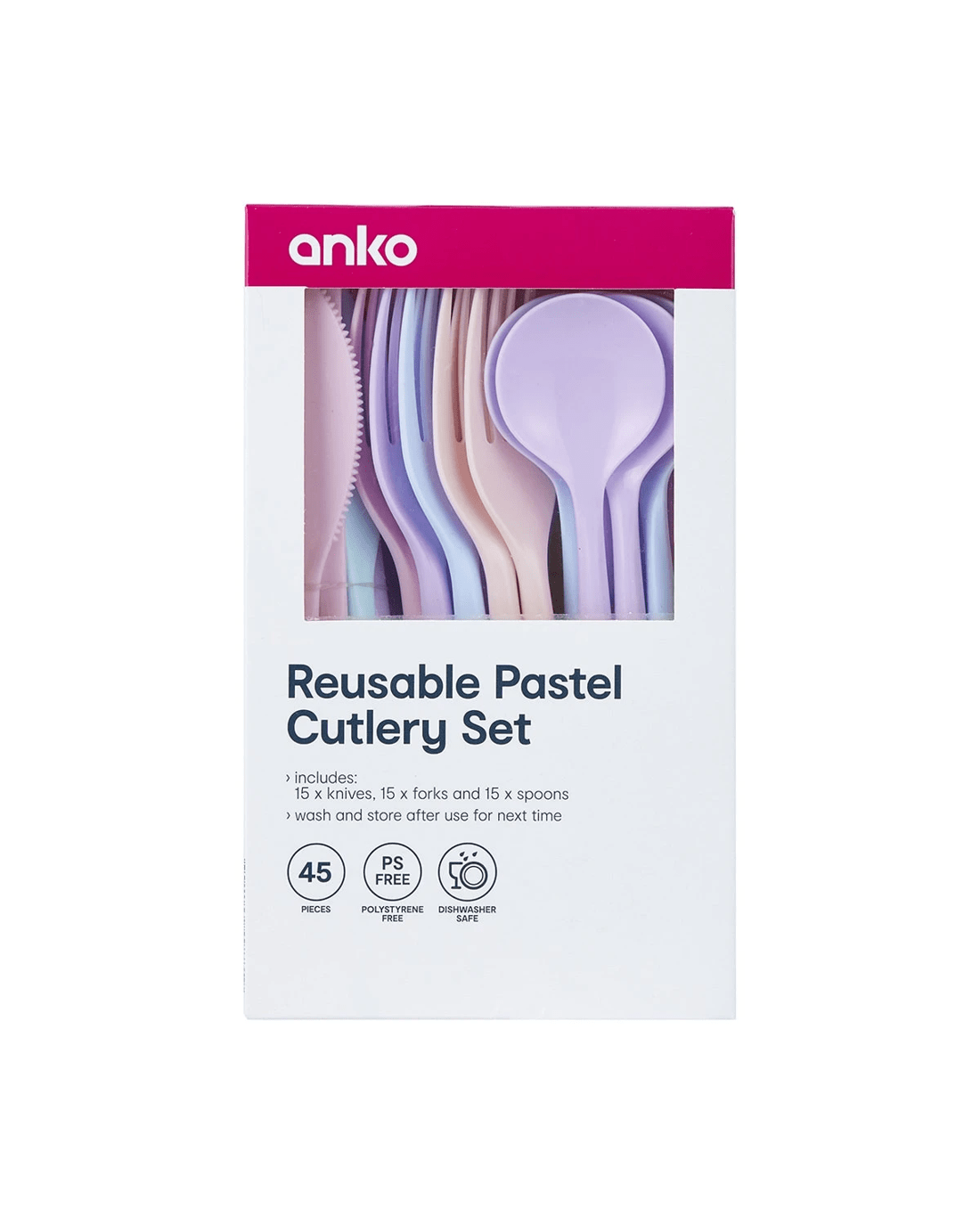 Sold by Kmart45 Piece Reusable Cutlery - Pastel