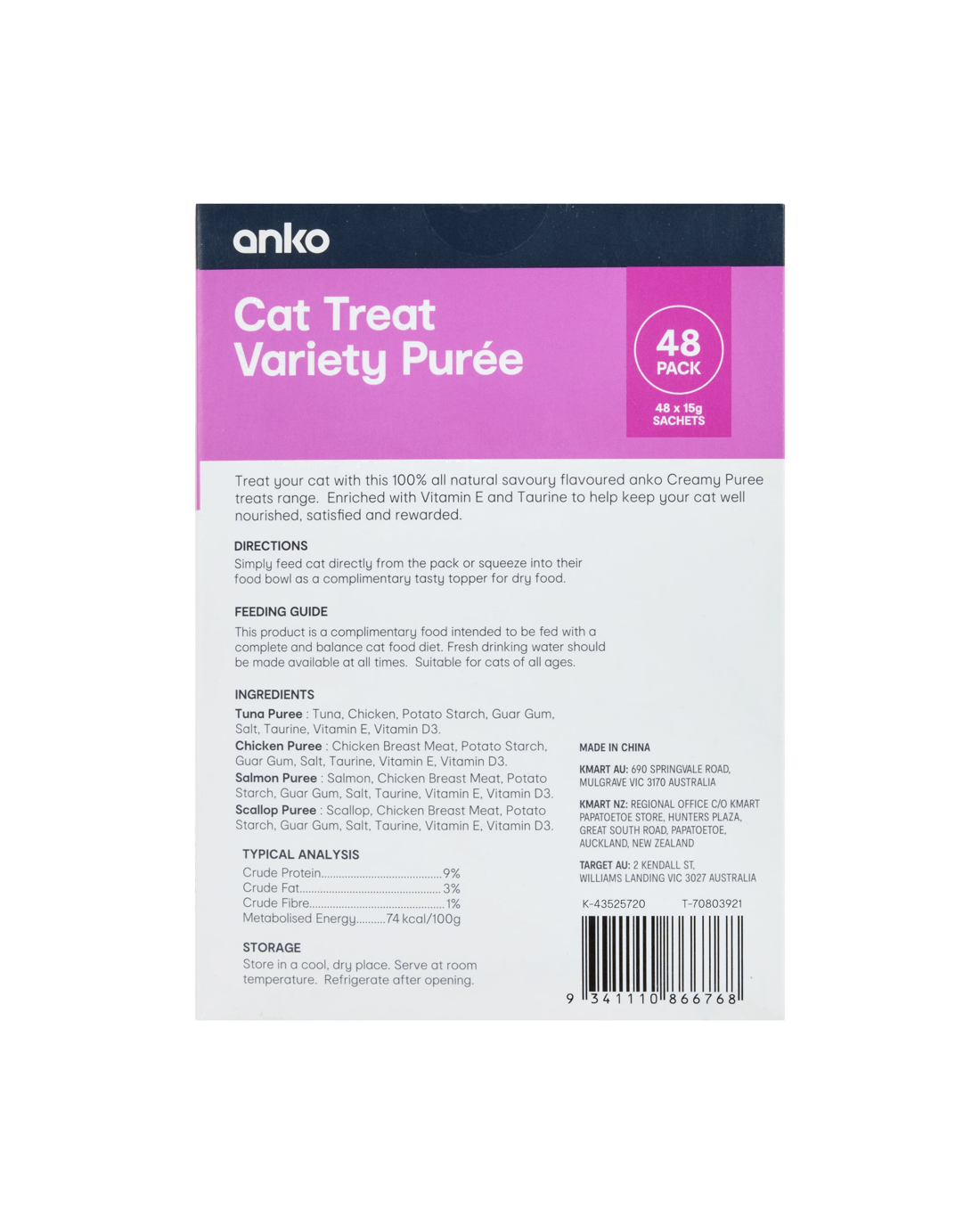 Treat your feline friend to the delightful Anko Cat Puree Sachets Variety 48 pack, designed to satisfy even the pickiest of eaters. Each sachet is filled with a smooth, flavourful puree that combines high-quality ingredients, ensuring a nutritious and tasty experience. With a variety of flavours included, your cat will enjoy a new taste sensation every day, promoting hydration and encouraging healthy eating habits. Perfect for use as a treat, meal topper or a way to administer medication, these convenient sachets make mealtime enjoyable and stress-free for both you and your pet.