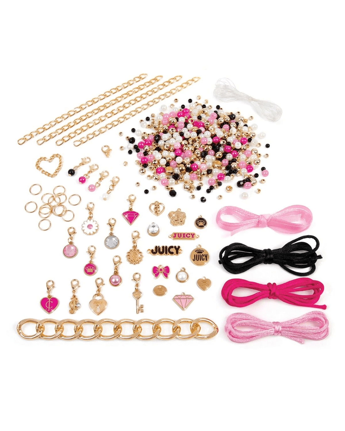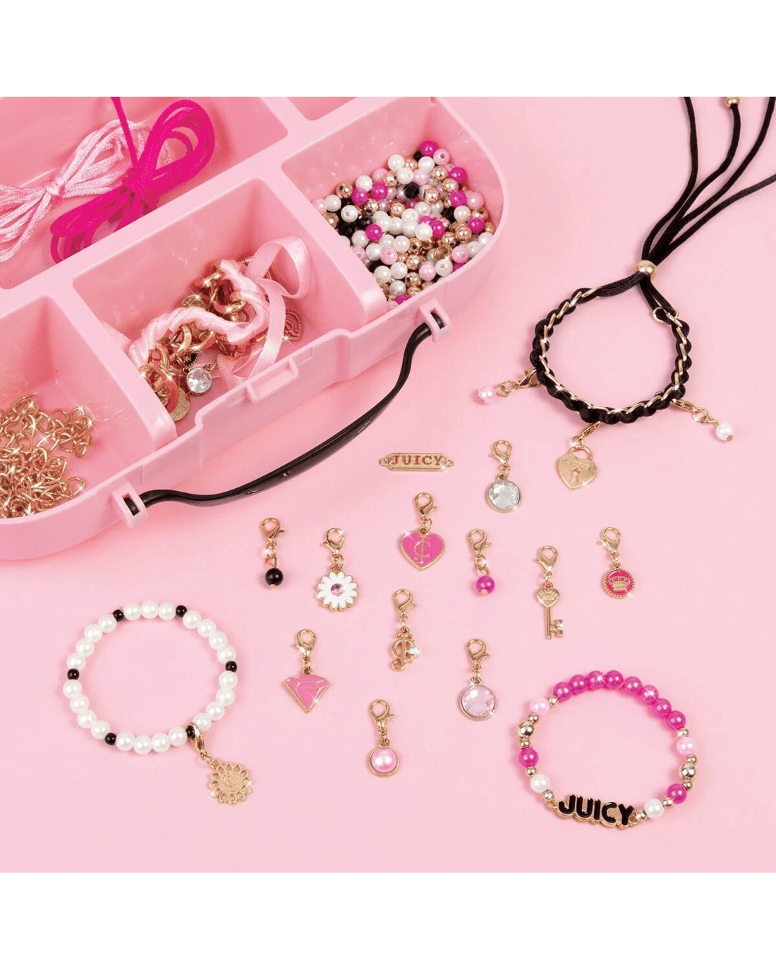 Get your glitz on! This chic storage case holds all the elements needed to make eighteen Juicy Couture? bracelets. Signature Juicy charms will adorn bracelets made using three techniques to please young fashionistas looking to develop their design skills! Enjoy 467 beads and charms ready for assembly and when the crafting is finished for the day, store all the remaining materials in the case. Take on the go whenever creativity strikes. This bracelet-making set is a great idea for crafty tweens, whether it?s for a holiday or a birthday. Encourage self-expression and creativity in kids.