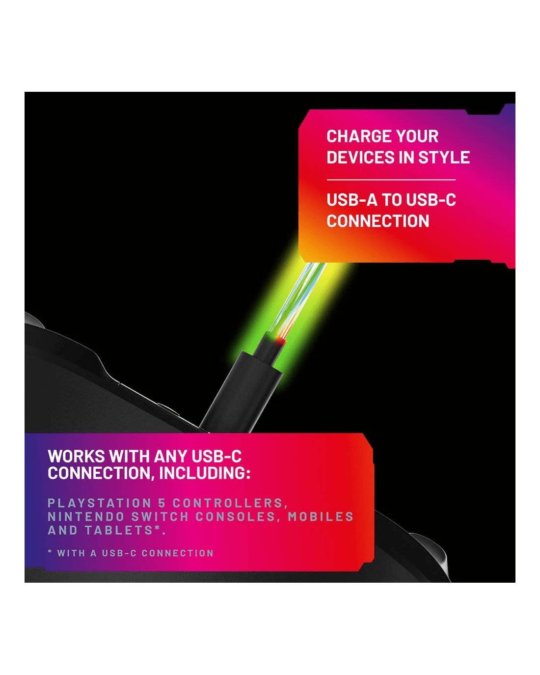 The 3m Light Up LED Play & Charge cable allows you to charge your PS5 DualSense Wireless controller or your Nintendo Switch while you game. The Light Up LED cables have a rainbow animated lighting effect to brighten up your setup.