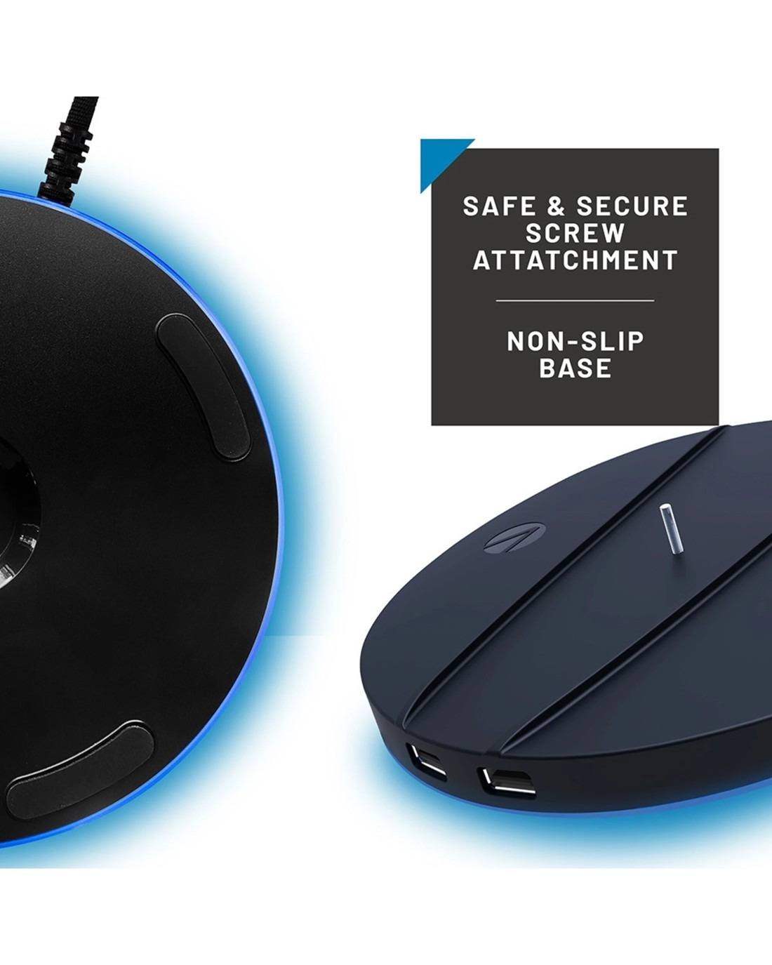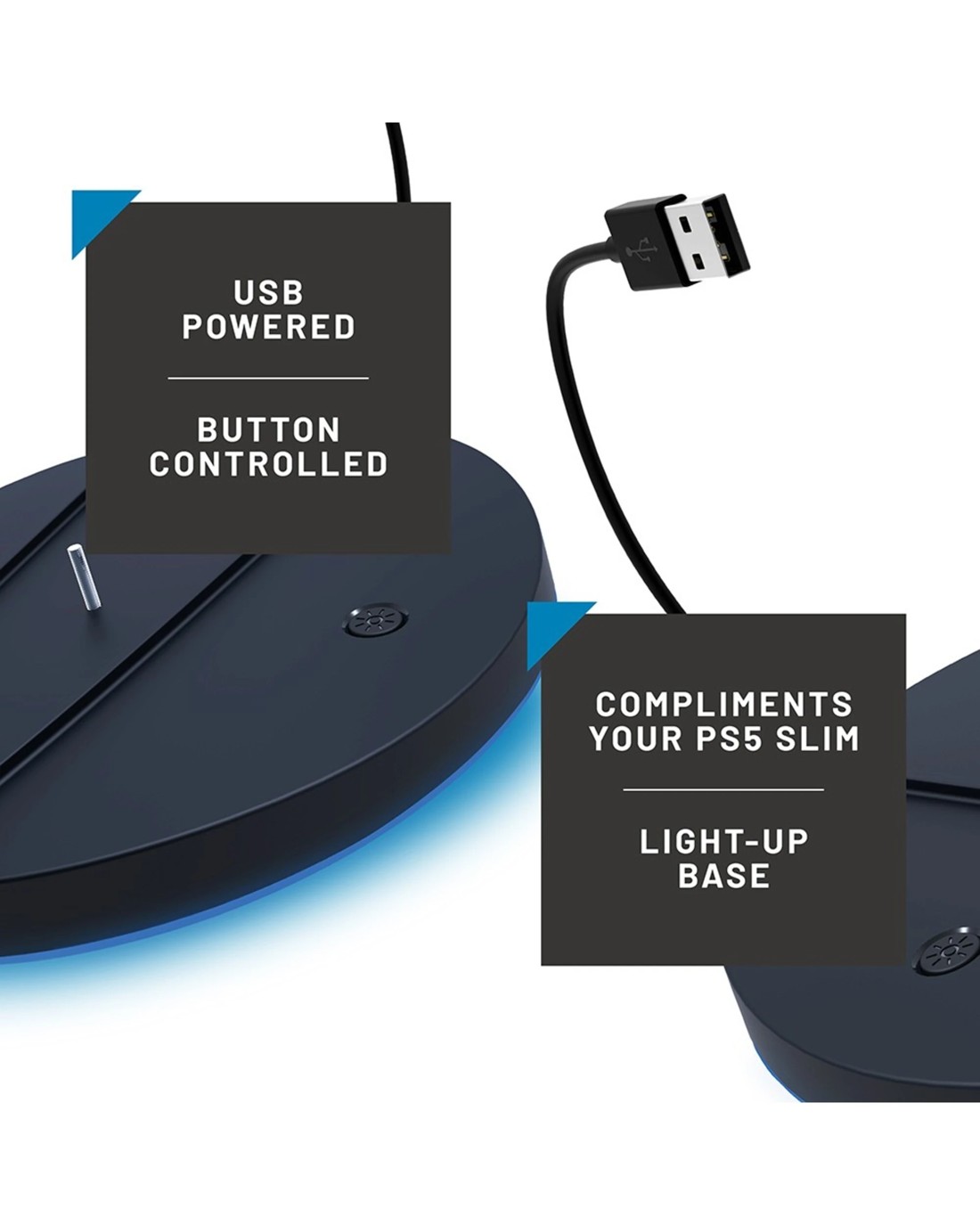 The PS5 Slim Vertical Stand is compatible with both the disc and digital editions of the PS5 Slim console. The stand features 2 USB ports, perfect for charging and powering additional PS5 accessories, as well as any other compatible USB devices. Its safe screw attachment and non-slip base enhances the stability of your PS5 Slim. Powered via USB, it seamlessly integrates into your gaming setup without the need for additional power sources. Add a touch of style to your gaming setup with lighting designed to complement the colours of the PS5 Slim console.
