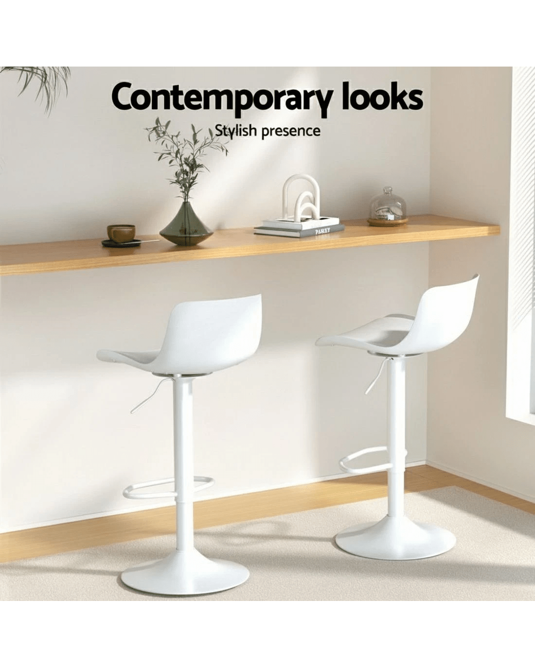 Relax and dine in style with our Artiss Fynn Bar Stools. With its classic design and contemporary good looks, the bar stool is a must for every house-proud person. Upholstered in premium PU leather with a strong PP backrest, the bar stools will support your guests over long evenings of wining and dining. A thick foam padded seat alongside a semi-circular footrest ensures relaxed sitting. The omnidirectional swivel seat makes it easy for guests to turn and follow the conversation. Height is easily adjusted with the SGS-tested gas lift. The large base always ensures stability, while a floor protector under the base helps to always keep your pristine floor scratch-free and prevent slipping. If you're ready to update your bar setting, you'll love the Artiss Fynn Bar Stool Set.