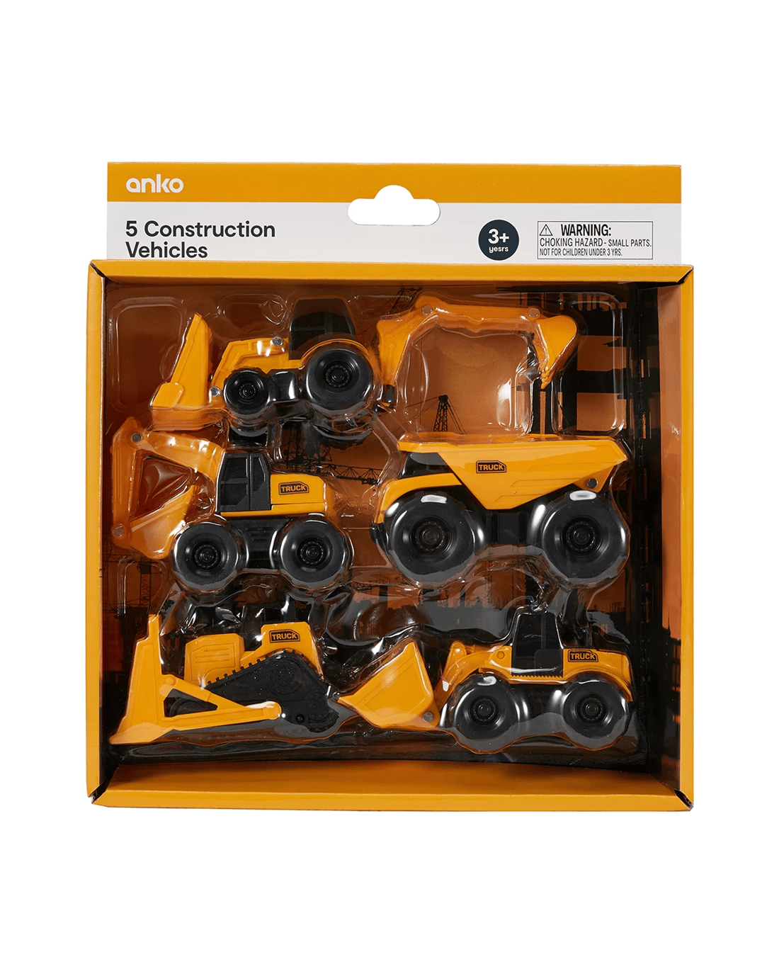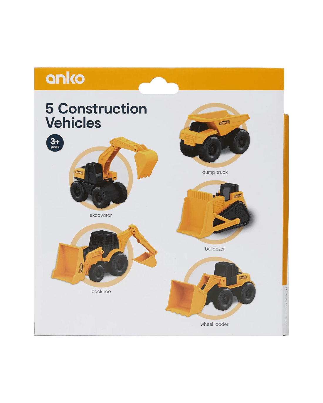 • Includes 1 x dump truck, 1 x excavator, 1 x bull dozer, 1 x backhoe and 1 x wheel loader