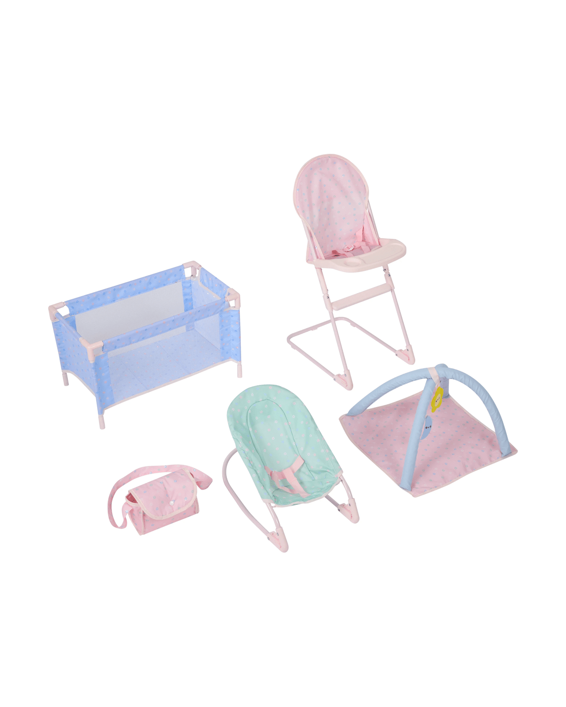 - Includes 1 x porta cot, 1 x high chair, 1 x bouncer, 1 x play gum mat and 1 x nappy bag