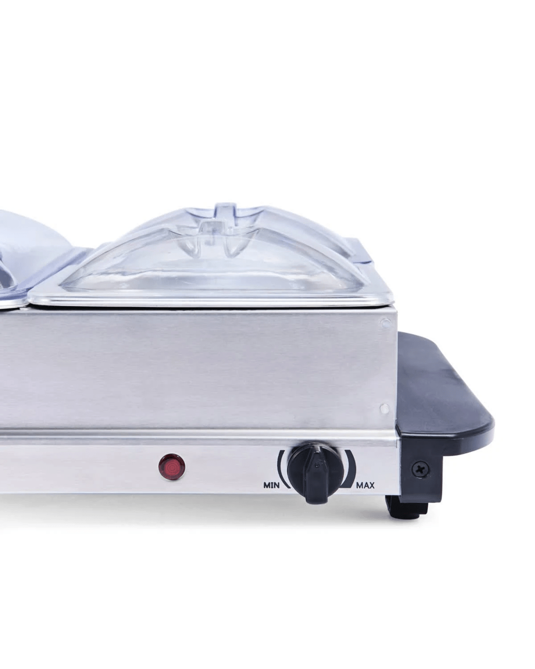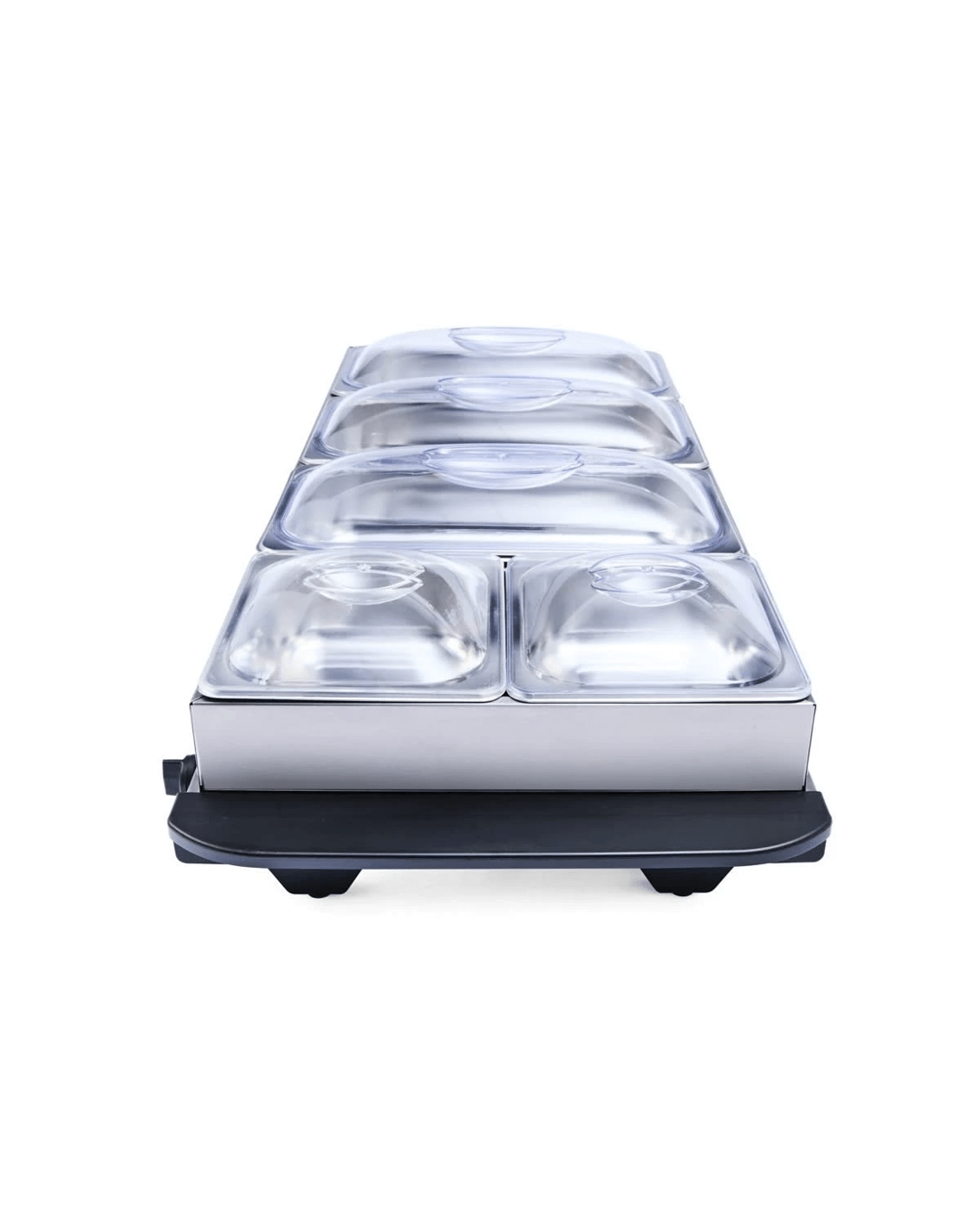 - Includes 3 x 2.4 litres warming pans and 2 x 1.1 litres warming pans