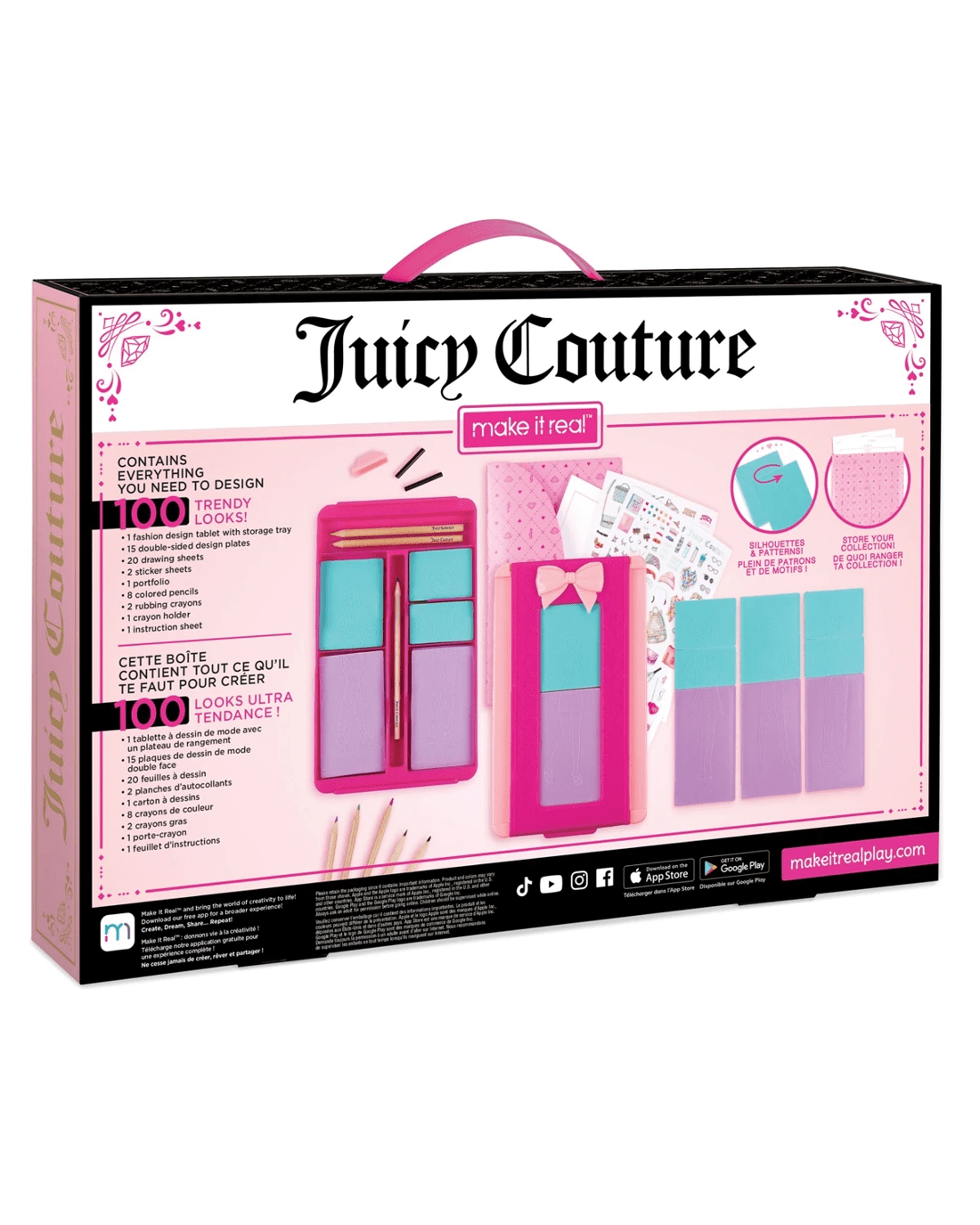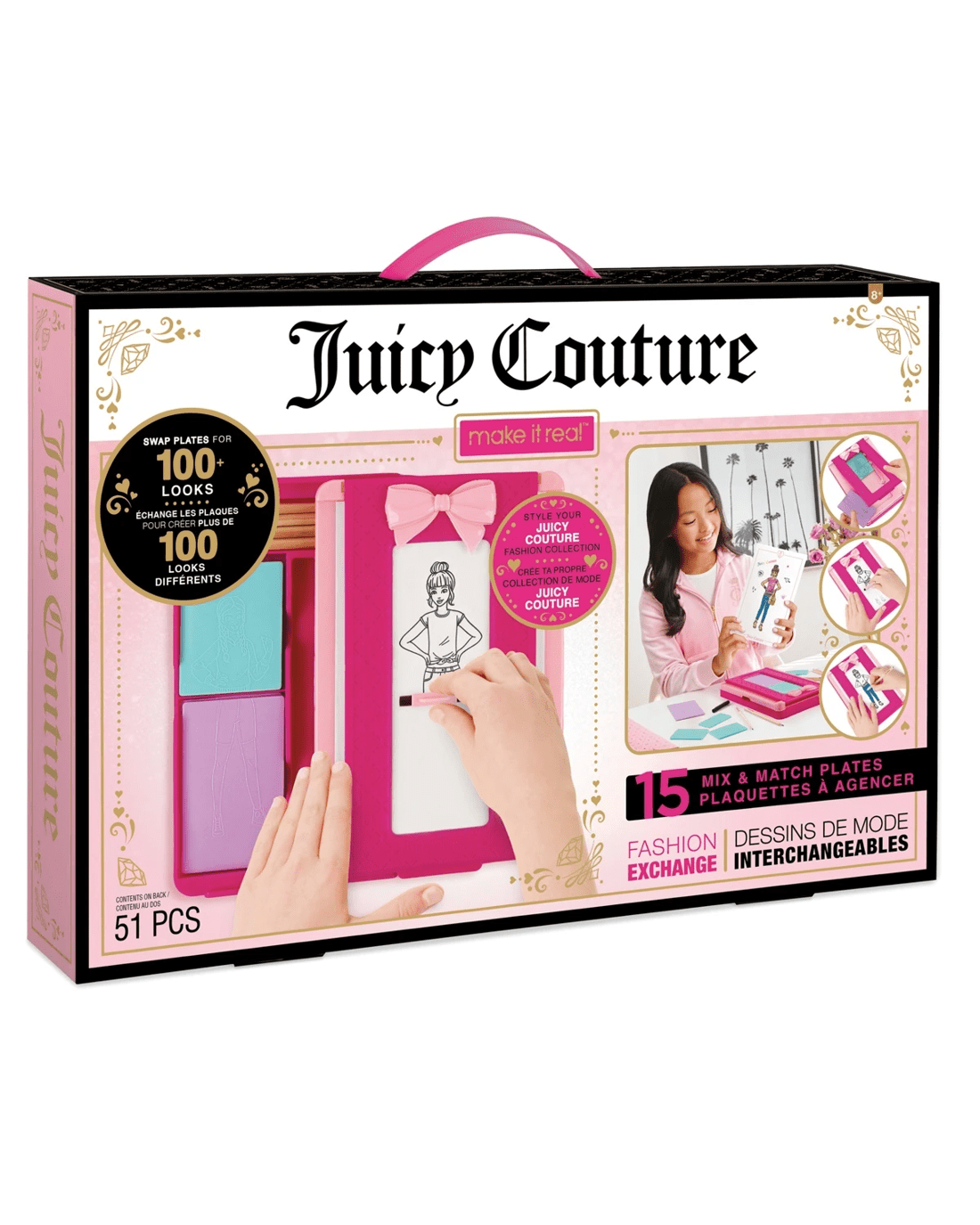 Juicy Couture Fashion Exchange: Ever wanted to be a fashion designer for Juicy Couture?  Juicy Couture Fashion Exchange makes that possible! Create hundreds of Juicy Couture fashion looks! Use the included rubbing crayon and holder, pencils and built-in textures on the back of the exchangeable plates to allow your fashion designer to easily add colour and detail to their one-of-a-kind looks! All plates and drawing materials store neatly in the drawer under the work surface. Portfolio included to store finished masterpieces.