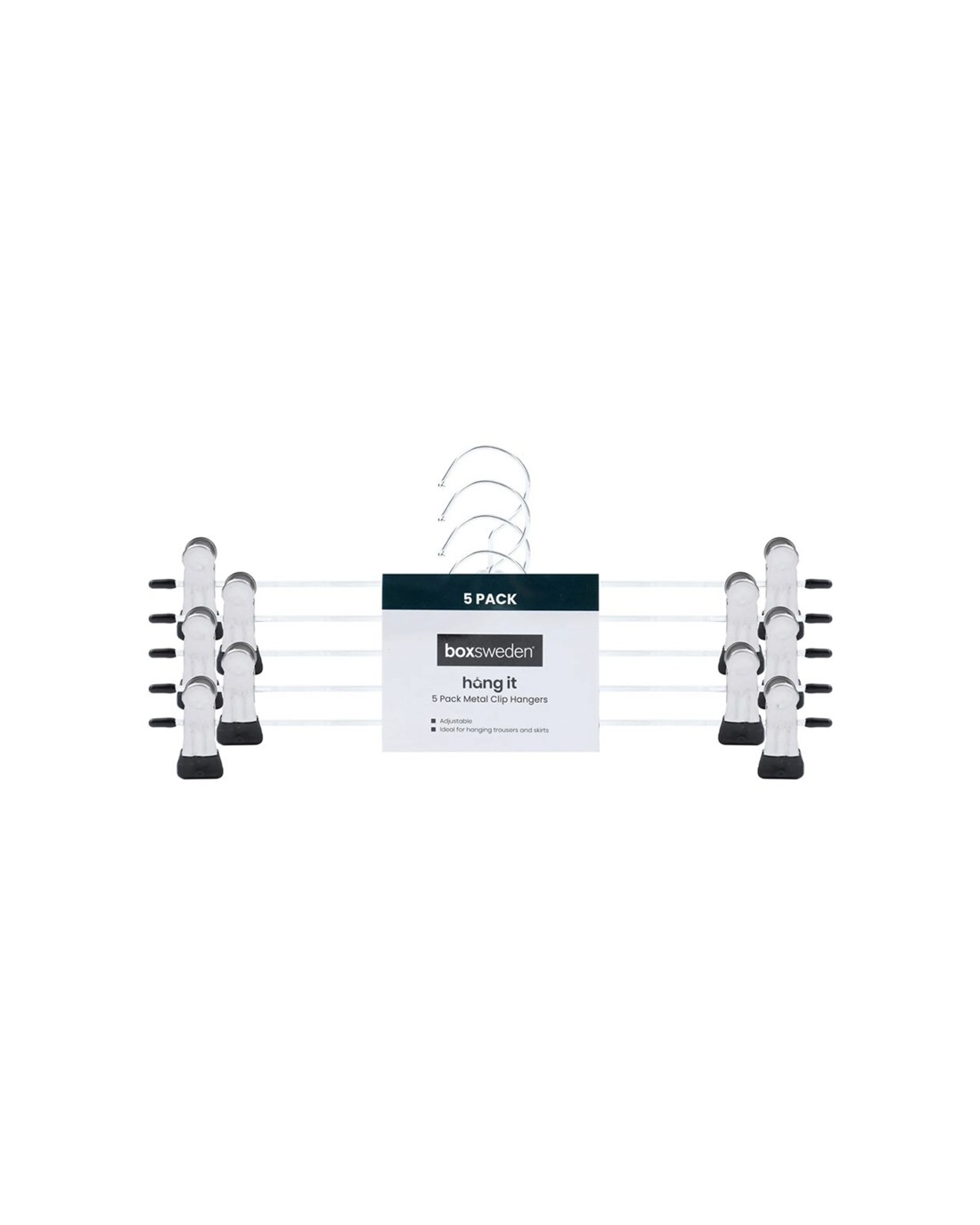 Keep your wardrobe tidy with our Boxsweden Hangit Adjustable Clip Hangers. Conveniently coming in a pack of five, our hangers are ideal for hanging trousers and skirts.