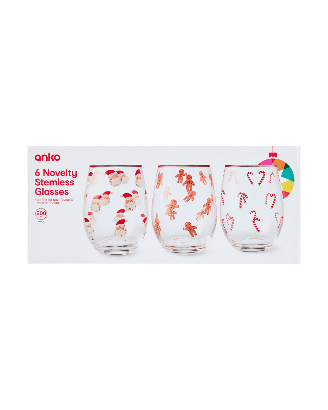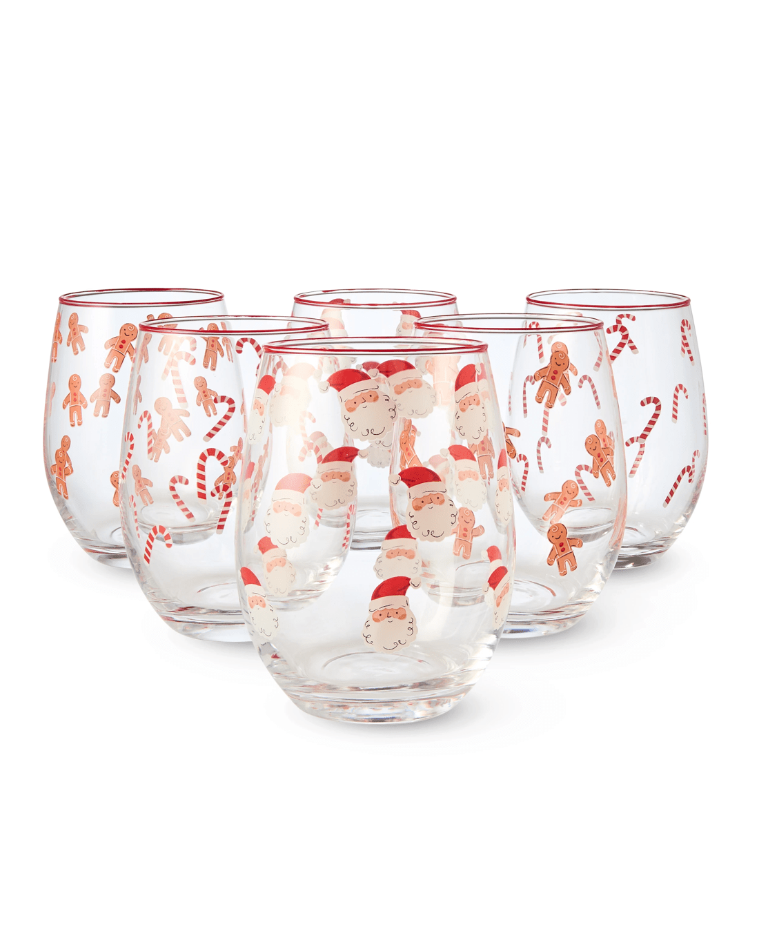 Add playful charm to your holiday gatherings with this set of 6 Novelty Stemless Glasses. Each glass features fun, festive designs, with Santa, Gingerbread or Candy Canes ideal for serving or seasonal drinks at Christmas parties.