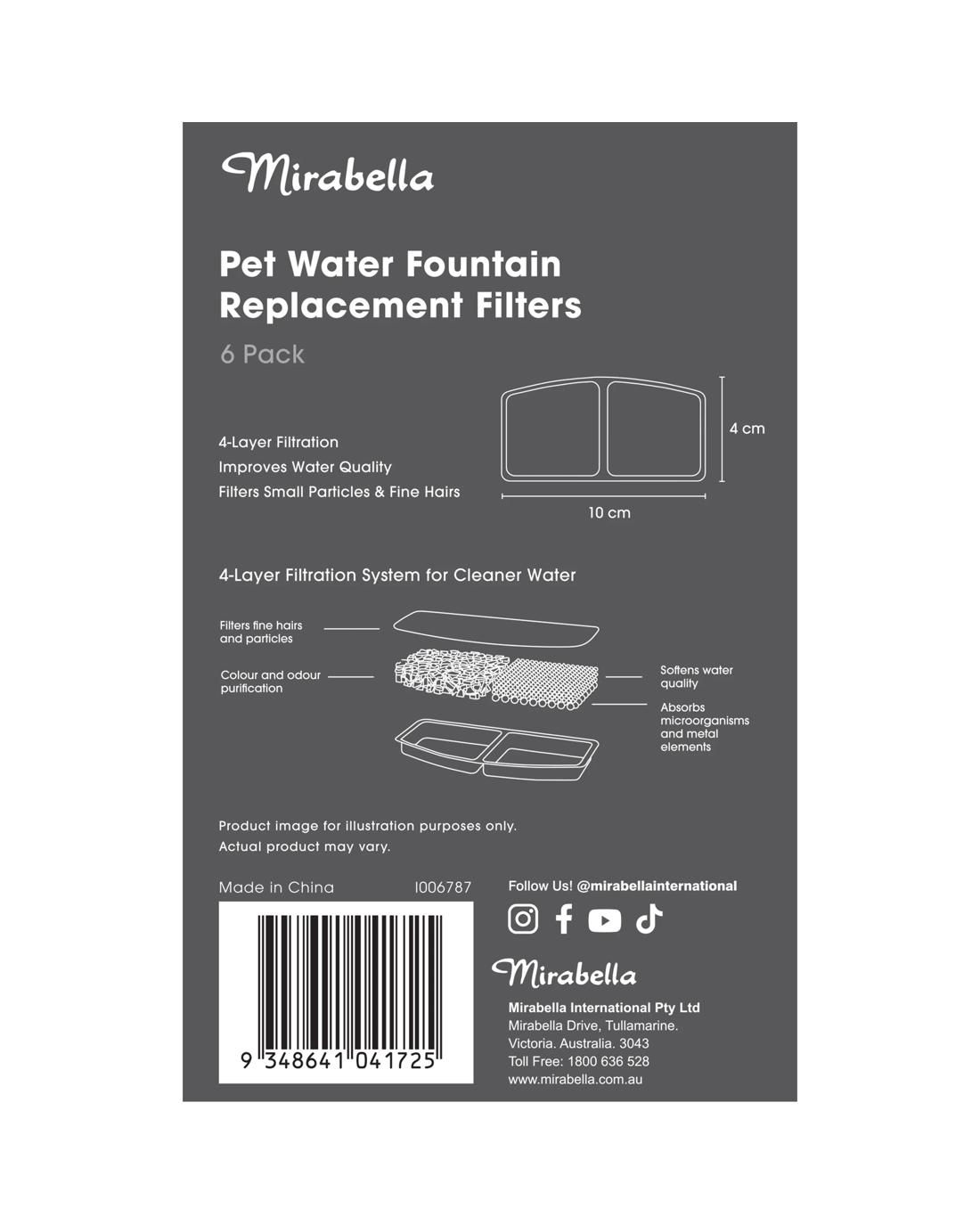 Designed for use with the Mirabella Portable Pet Filtered Water Fountain, these 4-layer replacement filters help ensure your pet always enjoys pure, great-tasting water. Each filter effectively removes hair, debris and impurities while reducing odours for cleaner, healthier hydration.