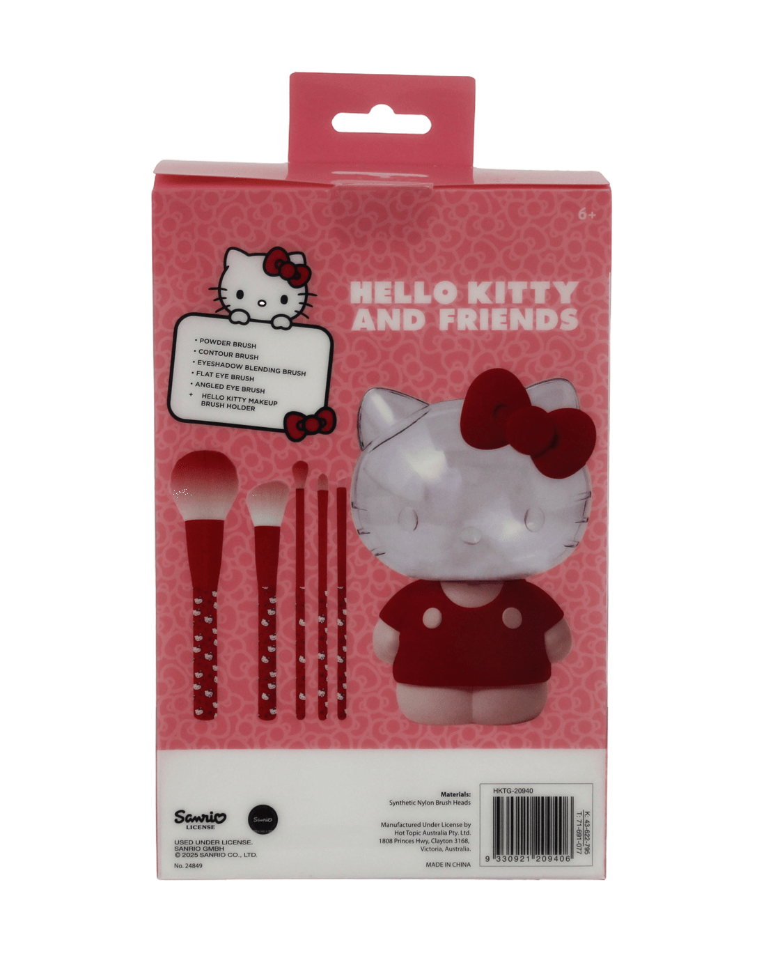 • Includes 1 x powder brush, 1 x contour brush, 1 x eyeshadow blending brush, 1 x flat eye brush, 1 x angled eye brush and 1 x Hello Kitty makeup brush holder