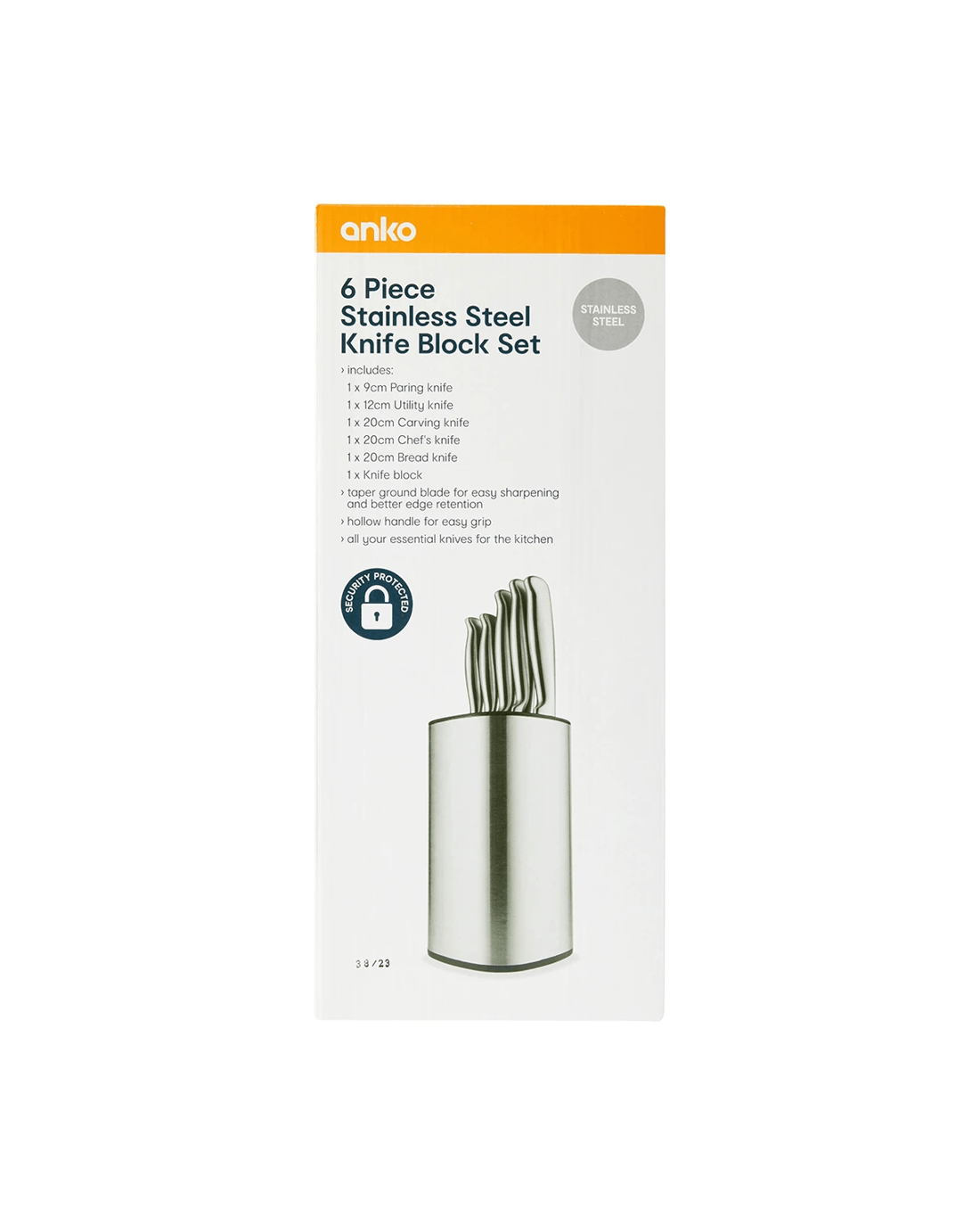 - Includes 1 x paring knife, 1 x utility knife, 1 x carving knife, 1 x chef's knife, 1 x bread knife and 1 x knife block