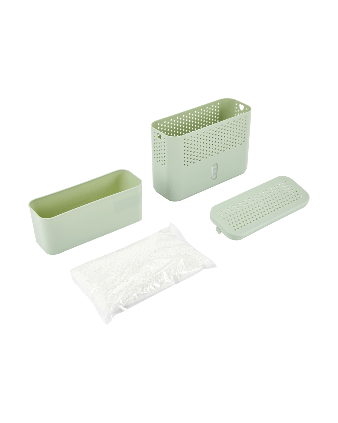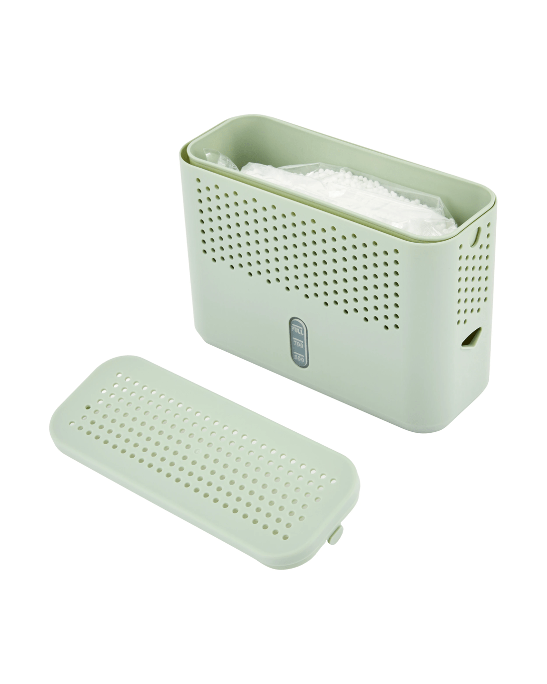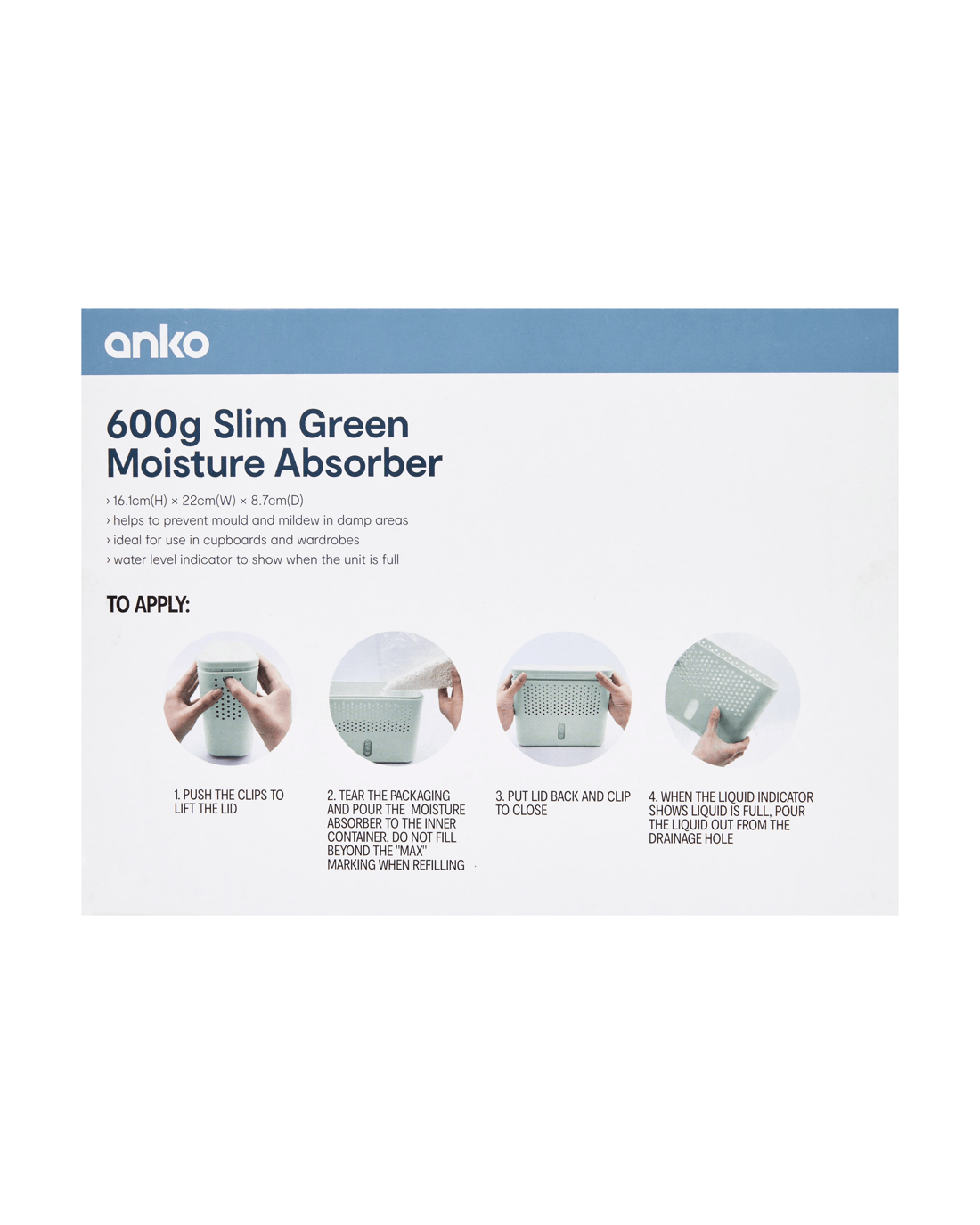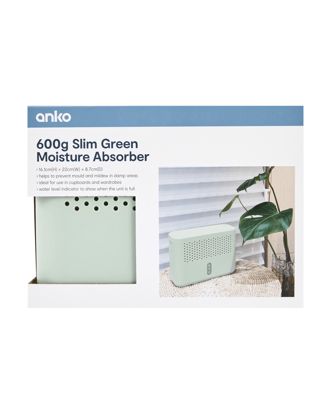 Tuck away the 600g Slim Green Moisture Absorber in tight spots - a compact option for helping reduce dampness in wardrobes, cupboards or other small areas.