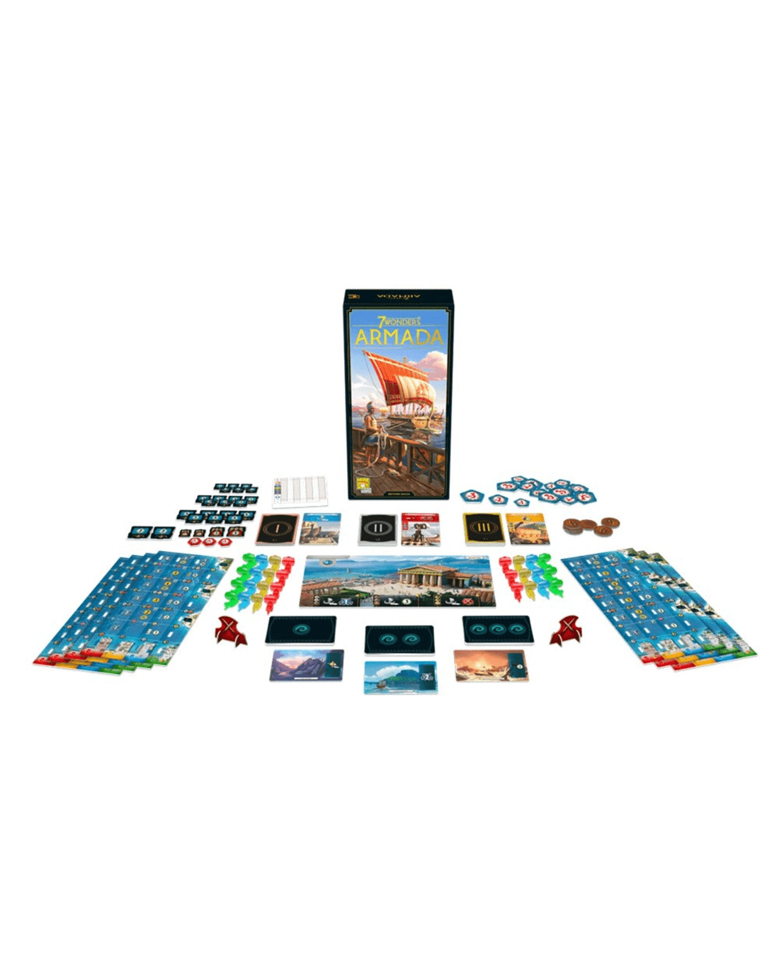 The horizon is now within reach: your armada is waiting for you to go conquer the seas! On board your ships, discover distant isles, trade with distant cities, and equip your fleets to take part in the upcoming naval warfare... In addition to a whole new Wonder, this expansion allows you to expand your interactions with two new types of cards: Armada and Isle cards. Navigators, explorers, shipowners, and pirates will give new depth to your games. Ages: 10 + | Players: 3 - 7